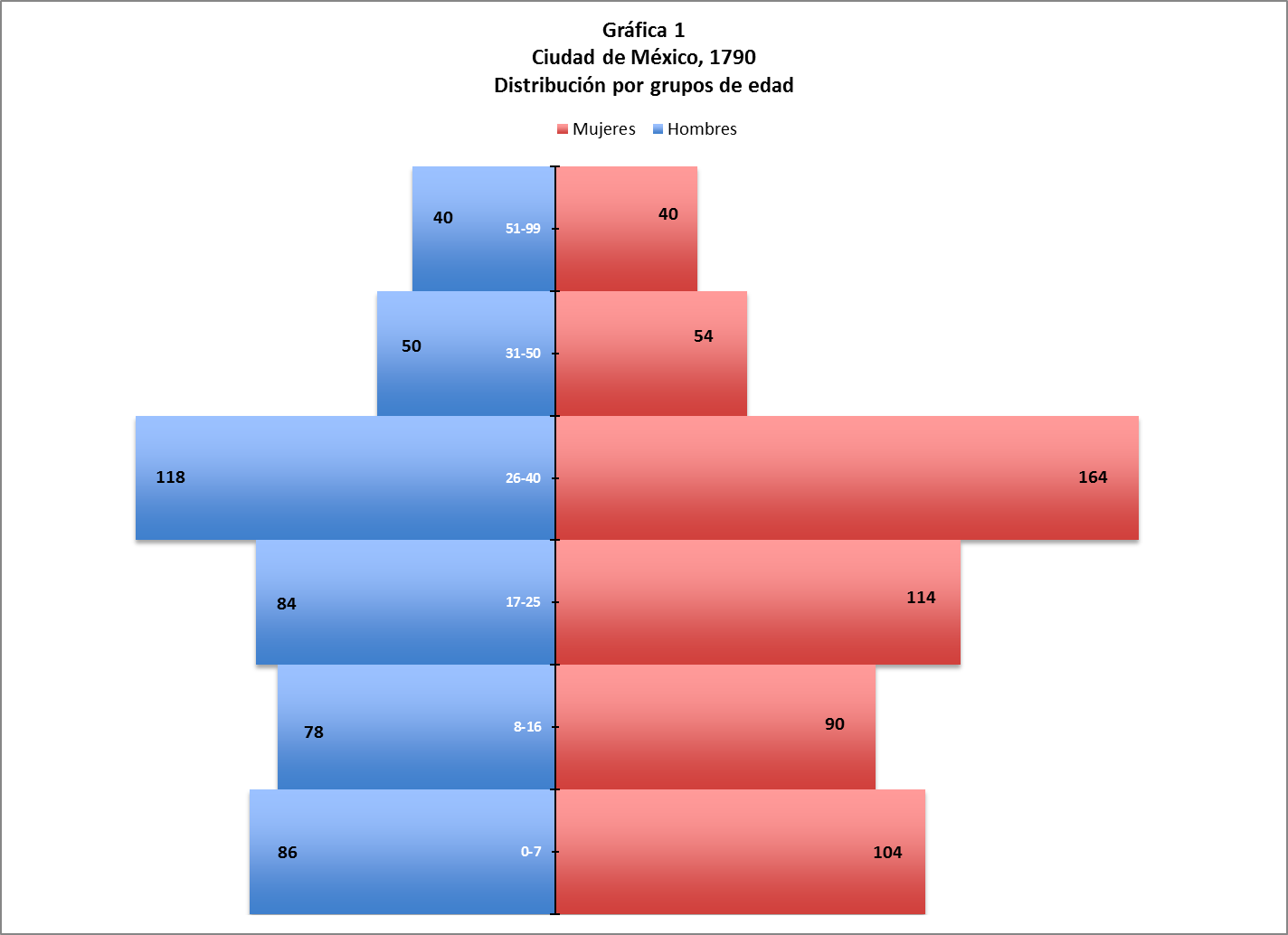 Gráfica 1. Distribución por edad y sexo en la ciudad de México, 1790.