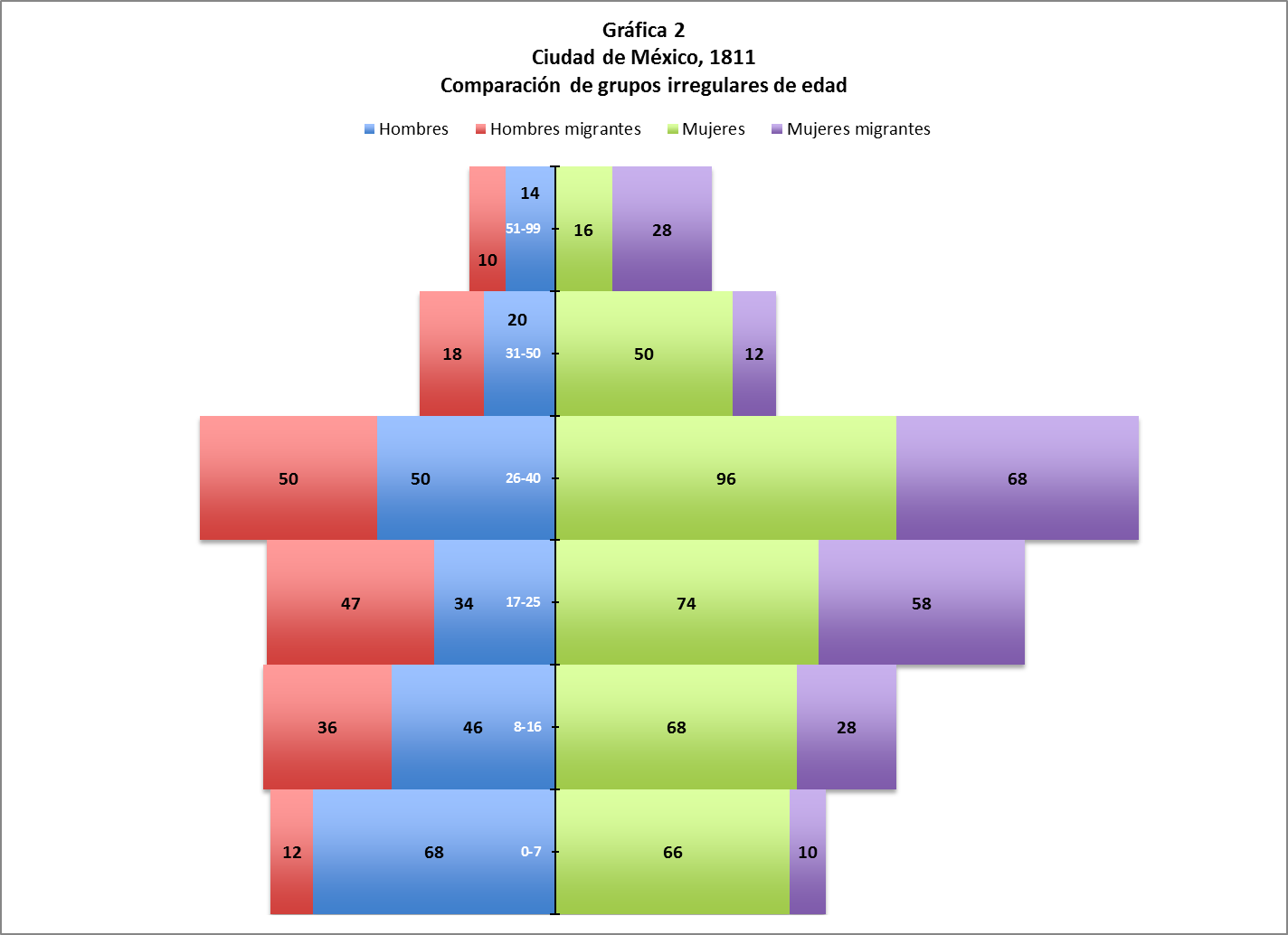 Los cálculos efectuados sobre los datos del padrón de la ciudad en 1811 muestran una composición de la población por edad y sexo, muy clara al respecto (véase gráfica 2). Este proceso modificó la estructura familiar y la presencia de hogares encabezados por mujeres. Las mujeres aventajaban claramente en número a los hombres en una relación de 78/100.
