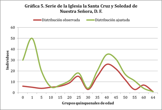 Esta es la de los antiguos habitantes del barrio de la Soledad, barrio indígena situado en una de las parcialidades indígenas en el área marginal de la capital. La temporalidad atribuida a estos entierros es el siglo xviii y parte del xix, y de acuerdo con investigaciones realizadas en esta serie, sus condiciones de vida debieron ser precarias dado su bajo nivel socioeconómico (Jaén et al., 1995a) . La serie es muy amplia, no obstante, existe una representación deficiente de menores de quince años, debido al área excavada, pues la mayoría eran adultos enterrados en el atrio de esta iglesia, y el sector donde fueron inhumados los niños sólo fue parcialmente explorado. [18] En esta serie se ajustaron los tres primeros grupos de edad, ya que la composición de la muestra es mayoritariamente de adultos en edades medias (entre los 40 y los 50 años de edad), y por cada hombre representado hay dos mujeres.