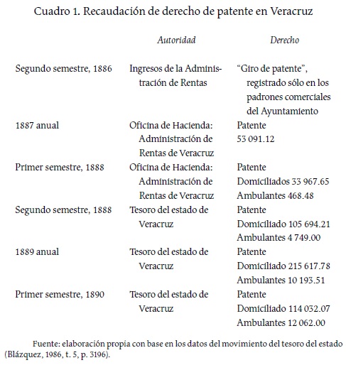 En 1878, don Luciano, un próspero comerciante del puerto de Veracruz, decidió abandonar su establecimiento que daba a la plaza del mercado de San Antonio. Un año después, un grupo de comerciantes establecidos amenazó al Ayuntamiento con seguir sus pasos. Entre las causas de su descontento estaban, por un lado, la incapacidad del gobierno local para mantener la plaza en buen estado y controlar a los comerciantes ambulantes y, por el otro, la falta de claridad en torno al cobro de los derechos municipales y los de consumo. Esta situación empezó a cambiar hacia 1886, cuando en los padrones comerciales se incrementó el número de establecimientos registrados como contribuyentes dispuestos a pagar derecho de giro.1 Tres años después, la tendencia de recaudación por derechos de giro aumentó notablemente, y cuando al fin se decretó la supresión de las alcabalas, el municipio cedió la recaudación de estos derechos al tesoro estatal. En el ámbito federal esta transición de derechos de consumo a derechos de patente fue un éxito de la reforma tributaria, ya que representó un primer paso para sustituir los impuestos indirectos, ligados al comercio, por los directos, que gravaban el capital.