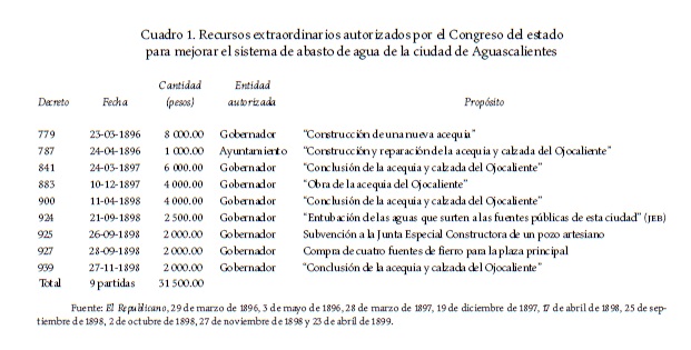 En el Aguascalientes finisecular el médico Díaz de León (1892, p. 200) hizo eco de la necesidad de contar con aguas potables, “transparentes y diáfanas”, para beber, cocinar y los demás usos domésticos. En la misma época, un “enamorado del agua” había observado que las acequias llevaban “sus caudales cristalinos por diversos suburbios de la ciudad”, pero que por desgracia estaba muy arraigada la costumbre de bañarse en ellas y de utilizarlas como lavaderos; en los barrios más pobres, esas aguas se usaban “para cocinar y para beber” (Correa, 1937, pp. 219, 222).