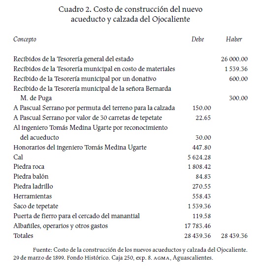 Fuente: Costo de la construcción de los nuevos acueductos y calzada del Ojocaliente. 29 de marzo de 1899. Fondo Histórico. Caja 250, exp. 8. agma, Aguascalientes.