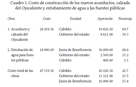 Cuadro 3. Costo de construcción de los nuevos acueductos, calzada del Ojocaliente y entubamiento de agua a las fuentes públicas