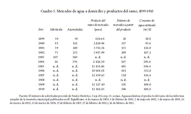 Cuadro 5. Mercedes de agua a domicilio y productos del ramo, 1899-1910