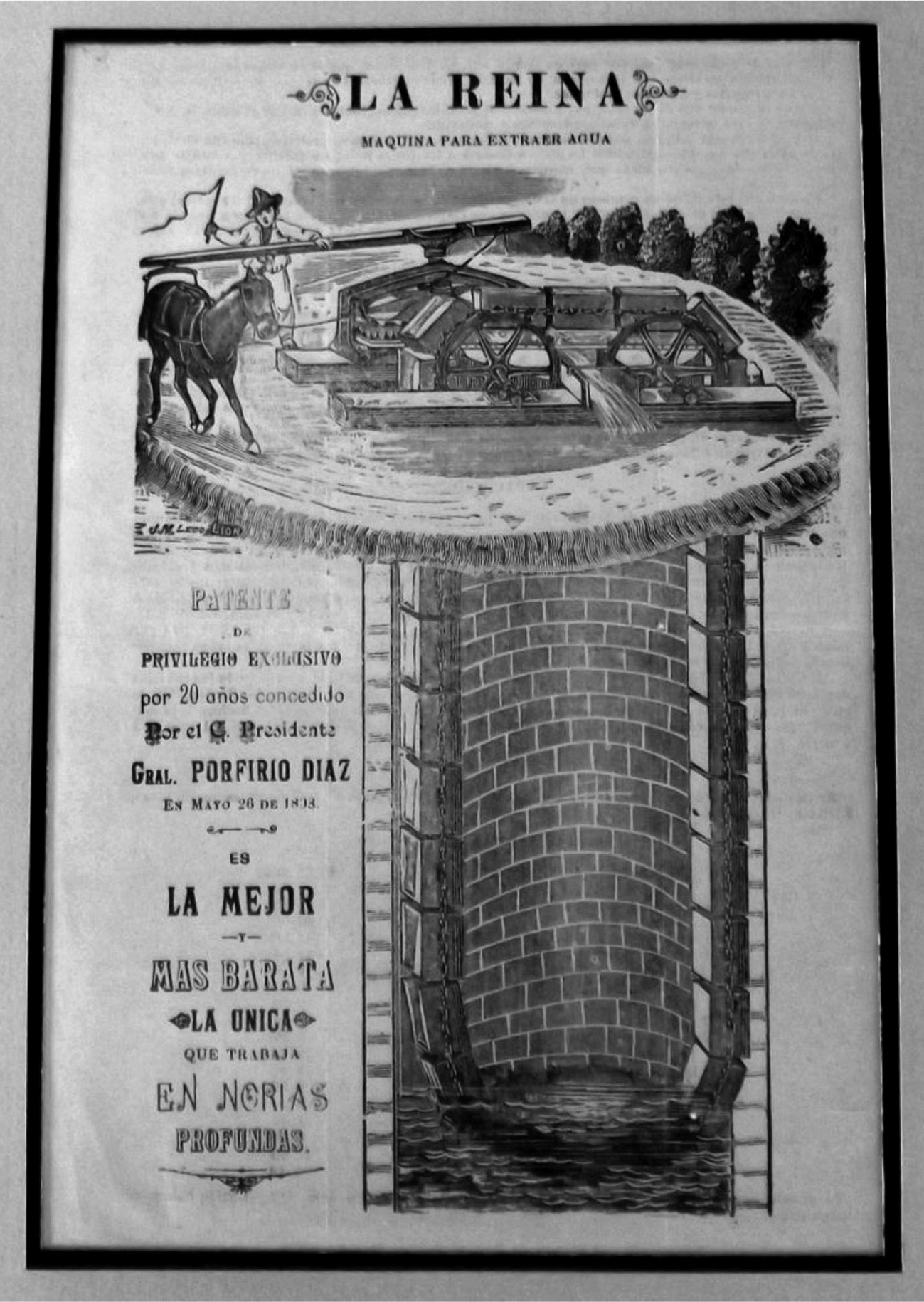 9 Sobre la compra de maquinaria para agua de la arboleda de la calzada Arellano. 28 de febrero de 1901. Fondo Histórico. Caja 270, exp. 2. agma, Aguascalientes. Por lo que se ve en el expediente se trataba de una noria muy popular en México, llamada La Reina.