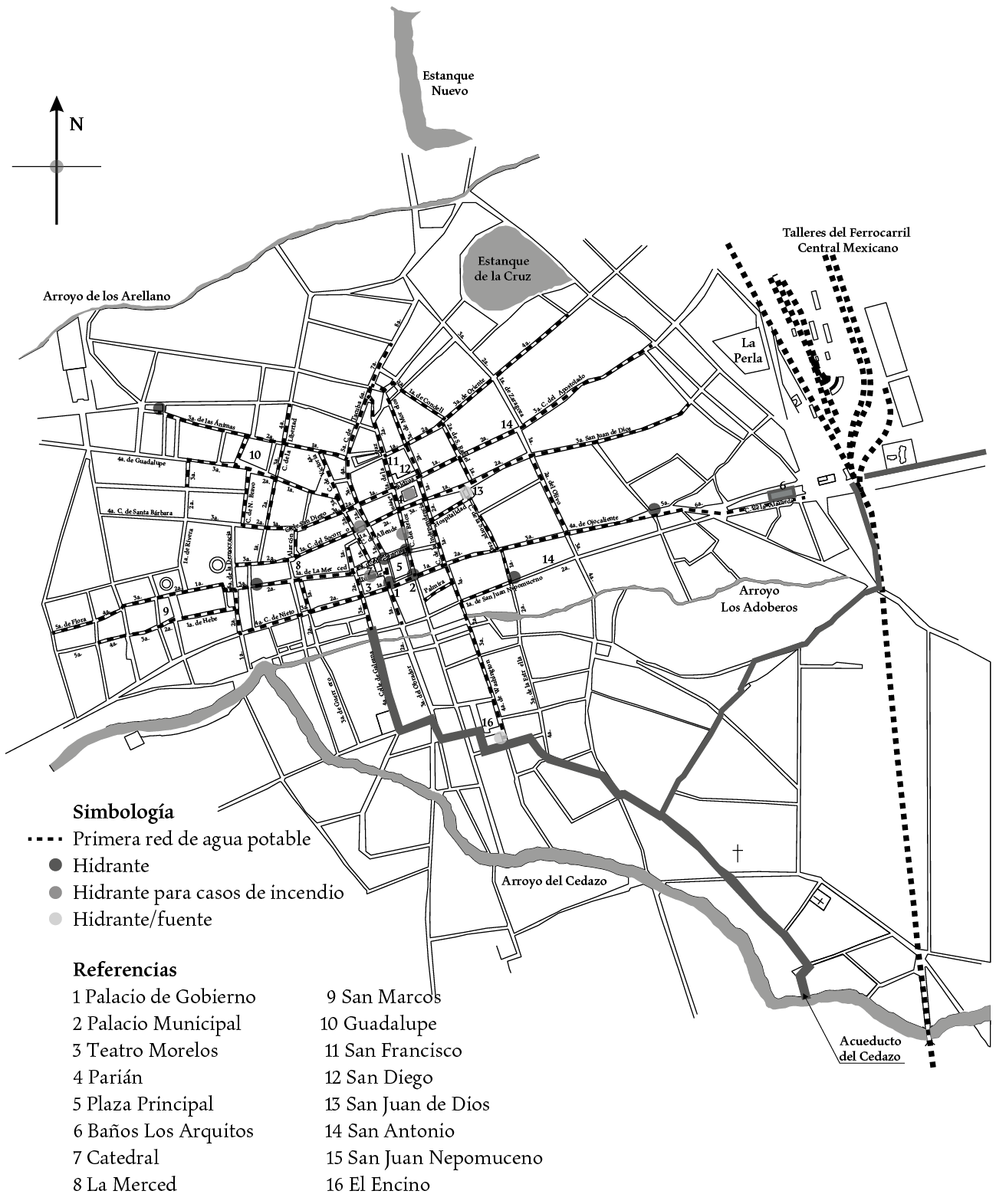 Imagen 4. Mapa de la primera red de agua potable de la ciudad de Aguascalientes.