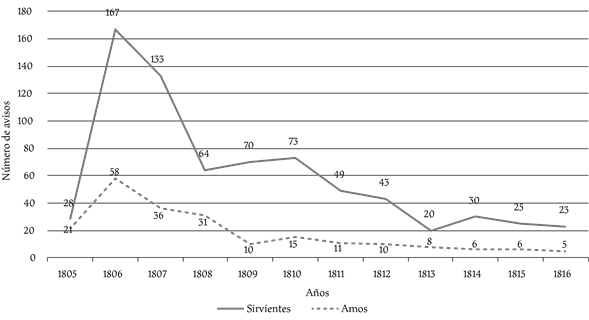 Gráfica 1. Número de avisos de amos y sirvientes, Diario de México, 1805-1816