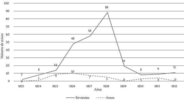 Gráfica 2. Número de avisos de amos y sirvientes, El Sol, 1823-1832