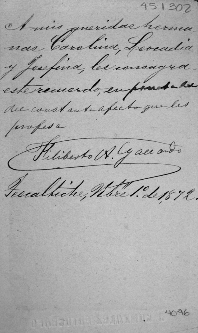 [20] No. Inventario 451302. FN-INAH, México. Inscripción al reverso: “A mis queridas hermanas Carolina, Leocadia y Josefina, les consagra este recuerdo, en prueba del constante afecto que les profesa Filiberto A. Gallardo. Tescaltiche Nobre 1° de 1872”.
