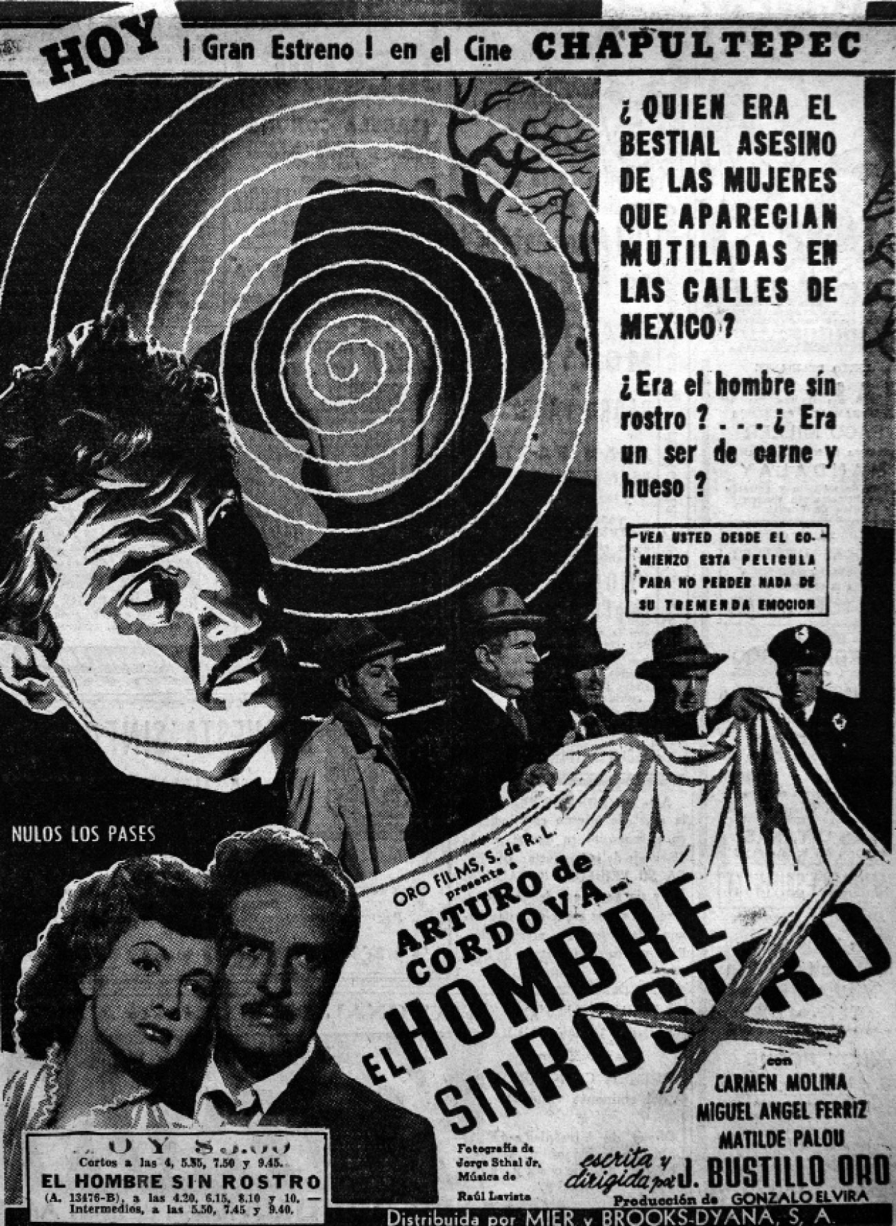 nació a Juan Bustillo Oro la feliz idea de realizar la obra”, El hombre sin rostro. Novedades, 8 de julio de 1950, p. 7.