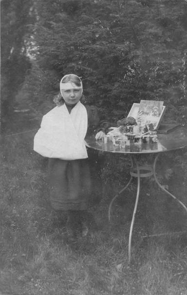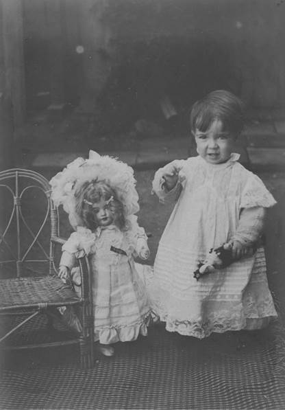 A su vez, los juguetes de las niñas (muñeca, casa de muñeca, vajilla) tenían por objetivo confortarlas en el espacio doméstico y acostumbrarlas a su futura función de esposa y madre. Verdadera dama en miniatura, la muñeca recibida por Amalia Errázuriz era lujosa, con un “cuerpo (…) de badana y color carne”, una “cara de porcelana blanca y rosada”, unos “ojos de cristal celeste” y un “cabello rubio verdadero” (Errázuriz, 1925, p. 18). Llamada Pelagia, en honor a la tía de Amalia, Pelagia Errázuriz Valdivieso, por el parecido de sus trenzas, la muñeca venía con un ajuar completo en una maleta, que incluía ropa interior en encaje de Valencienne, vestidos de muselina, seda y lana, sombreros, accesorios para peinarlas y joyas.[12] Como se trataba sin embargo de un objeto de lujo más que de un verdadero juguete, se ordenó muy luego en su maleta y Amalia no pudo jugar con ella más que en ciertas ocasiones, lo que permitió la perennidad del objeto (Errázuriz, 1925, pp. 17-19).[13] En una fotografía de circa 1905, que retrata una de las hijas del poeta y dramaturgo Manuel Magallanes Moure (1878-1924), se puede apreciar un ejemplo de este tipo de muñeca, con su vestido, sus inglesas con tocado de pluma y su abanico (véase imagen 2). Incluso algunas tenían un mecanismo que les permitían hablar, como la que le fue regalada a Carmen Lynch en 1891, que podía decir papá y mamá (Díaz, 2016, p. 72).
