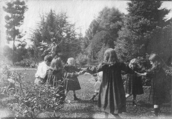 Algunas fotografías (imágenes 3, 4 y 5) dejan ver ejemplos de juguetes, como el caballo de madera que sostiene Blanca Subercaseaux en sus manos, o el pequeño bote que se encuentra sobre una mesa a su lado. Otro ejemplo es el rompecabezas de cubos de madera, cada cara correspondiendo a una imagen, con el cual posa Margarita Errázuriz en 1901 (tuvo un accidente en el pensionado donde se encontraba con sus hermanas, lo que explica el brazo en bandolera y el vendaje en la cabeza). Estos juegos de interior y solitarios se oponían a los juegos de exterior y grupales, que desarrollaban la sociabilidad de los niños. Es el caso de las rondas, como se aprecia en una fotografía tomada en la hacienda de Panquehue en 1901, donde los primos Errázuriz Valdés y Errázuriz Vergara compartían una ronda, independiente de su género y de su edad.