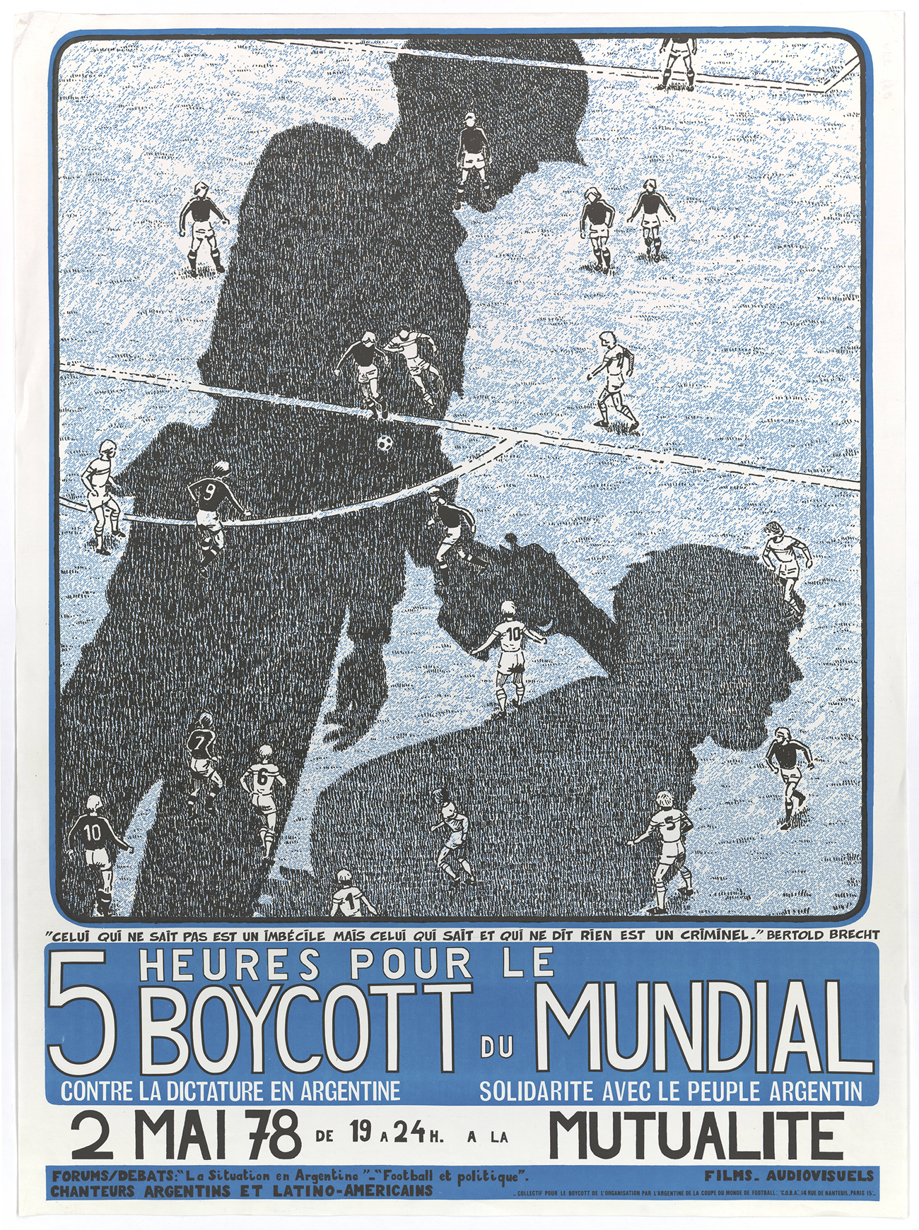 1 El cartel forma parte del fondo de la Biblioteca Pierre Monbeig (bpm) del Institut des Hautes Études de l’Amérique Latine (iheal), París 3 Sorbonne Nouvelle, signatura AFF186. Está firmado por el Collectif pour le Boycott de l’Organisation par l’Argentine de la Coupe du Monde de Football (coba).