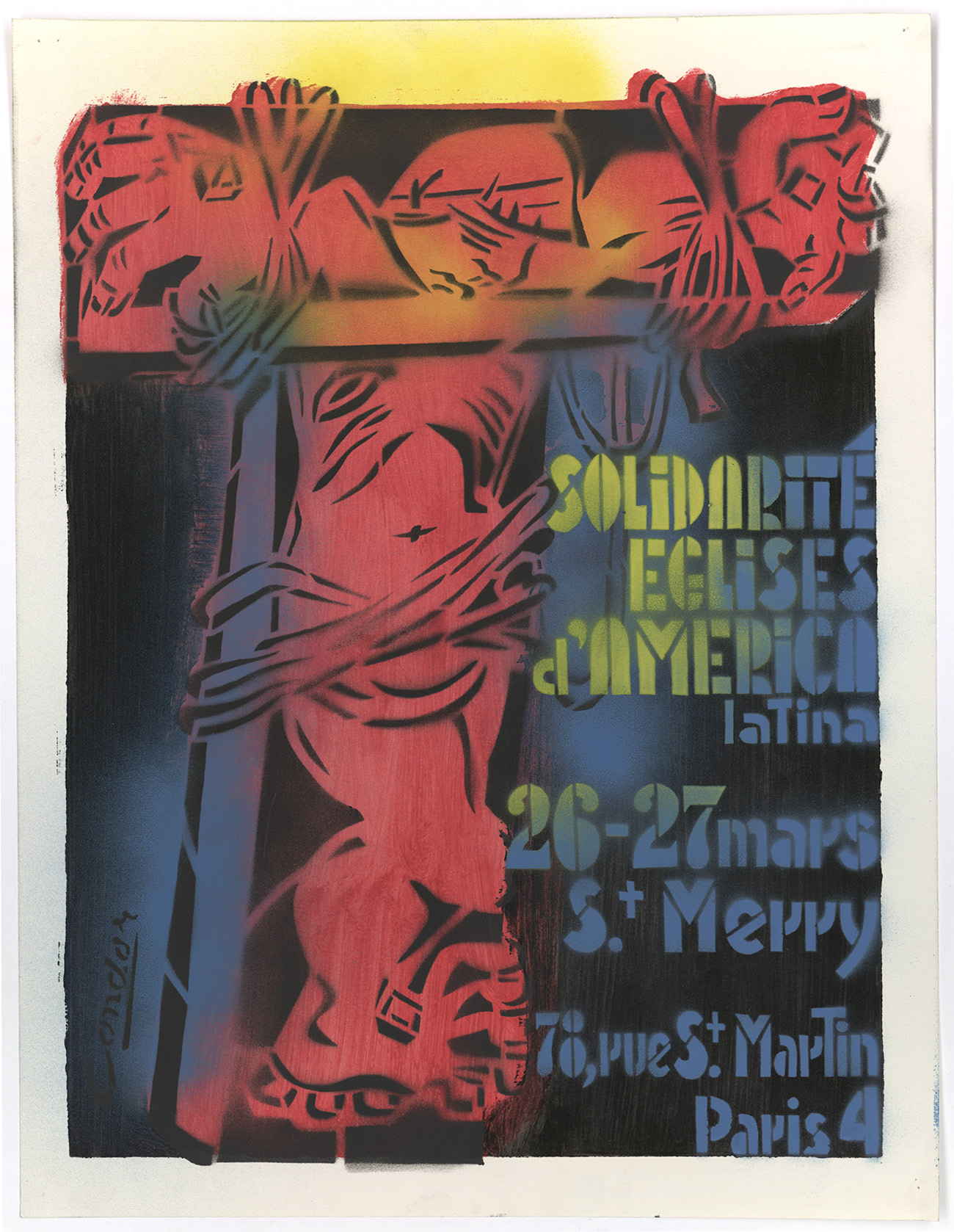 La iglesia de Saint-Merry, en el barrio Le Marais, parecía compartir espacio con el Comité Amérique Centrale Oscar Romero (núm. 7). Este barrio del corazón de París, de origen judío y actualmente gentrificado, es uno de los más antiguos de la ciudad. La iglesia Saint Merry, situada entre el Museo Georges Pompidou y la torre Saint-Jacques, albergó varios eventos solidarios afines a la teología de la liberación, como se advierte en un cartel que muestra la imagen de un Cristo en colores y convoca al evento “Solidarité des églises d’America Latina” (véase imagen 2). Saint Merry también organizó numerosas actividades conjuntas con el Comité Catholique contre la Faim et le Développement (ccfd), que sigue activo hasta la fecha.