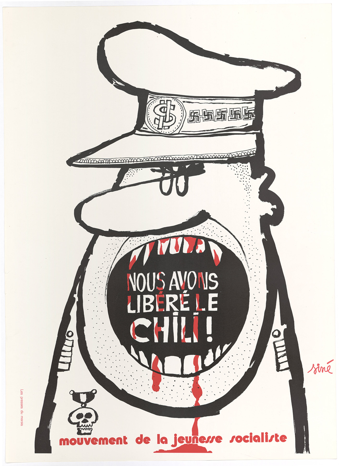 En su estado actual, esta investigación no ha concluido un estudio exhaustivo de otros fondos de carteles en París. Sin embargo, los registros de esos fondos e investigaciones recientes sobre ellos permiten validar esta periodización. La biblioteca La Contemporaine alberga una nutrida colección de materiales sobre el golpe de Estado en Chile14 que ha sido objeto de seminarios e investigaciones.15 Los autores del catálogo de la exposición Internationales Graphiques (Tardy y Tesnière, 2016)16 consideran clave el periodo de 1970 a 1990 y reconocen al golpe de Estado chileno como su mayor acicate en América Latina. Uno de ellos es Julien Hage (2016, pp. 47-51), quien apunta que tras este evento se formaron en Francia 18 organizaciones sindicales y partidos de izquierda que denuncian el terror y la represión, que a su vez generaron 400 comités de solidaridad. La magnitud de la solidaridad con Chile también es tangible en otras colecciones del mundo.17