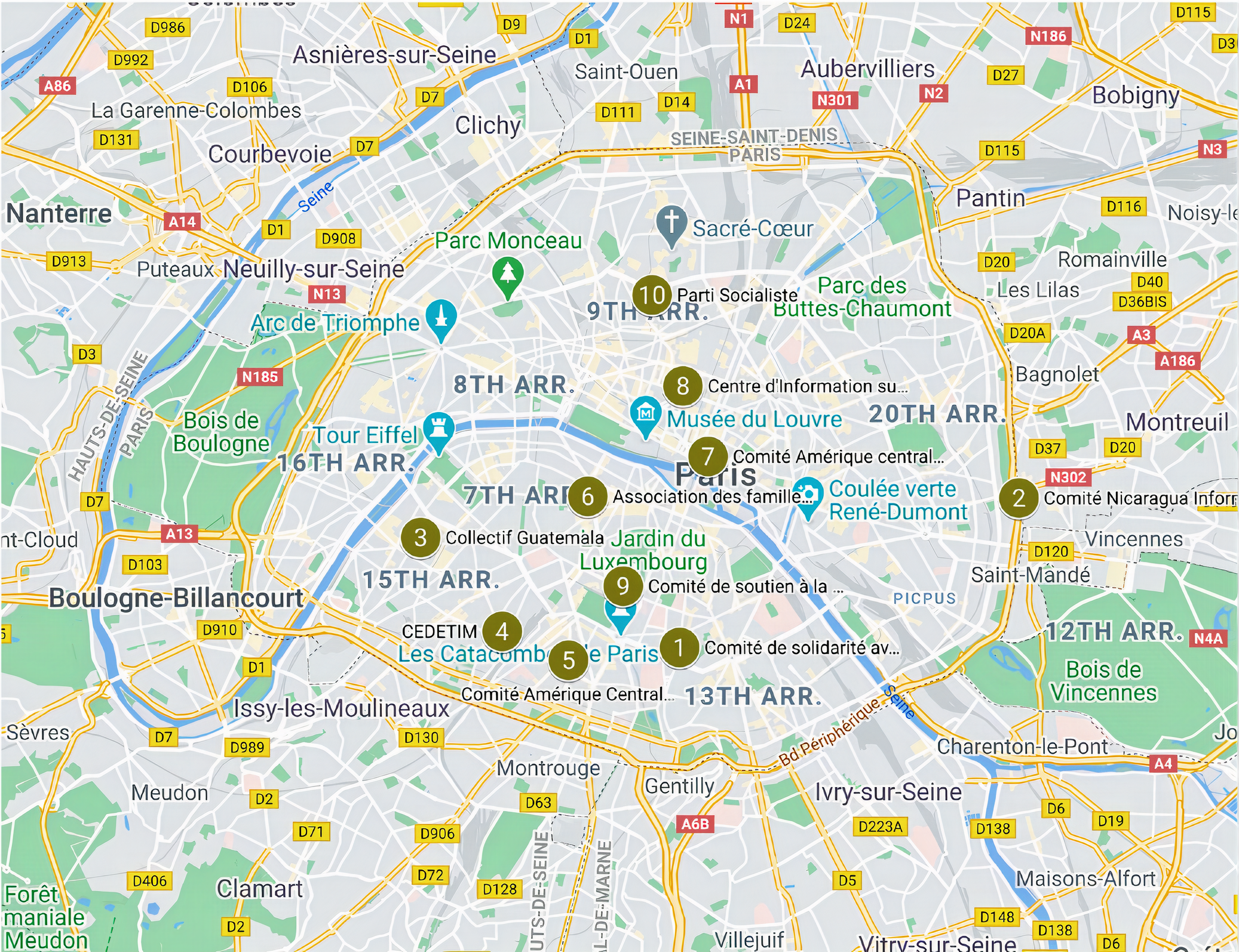 Ciertos comités se ubicaban en barrios de numerosa población migrante y obrera. Por ejemplo, el Comité Nicaragua Information estaba muy cerca de la Puerta de Montreuil, vecino al edificio que actualmente alberga las oficinas de la Confederación General del Trabajo (cgt) (núm. 2). En esta zona, y en particular el área que colinda con el distrito xi de París, se situaban algunas imprentas independientes que editaron algunos carteles de nuestro corpus, como Darboy (Montreuil, sin dirección), Primavera (70, rue des Maraîchers), npp (56, rue des Haies) y Rotographie (2, rue Richard Lenoir, Montreuil). Cabe mencionar que la Puerta de Montreil y la plaza de Nation han sido, hasta la fecha, importantes centros de congregación de multitudes.
