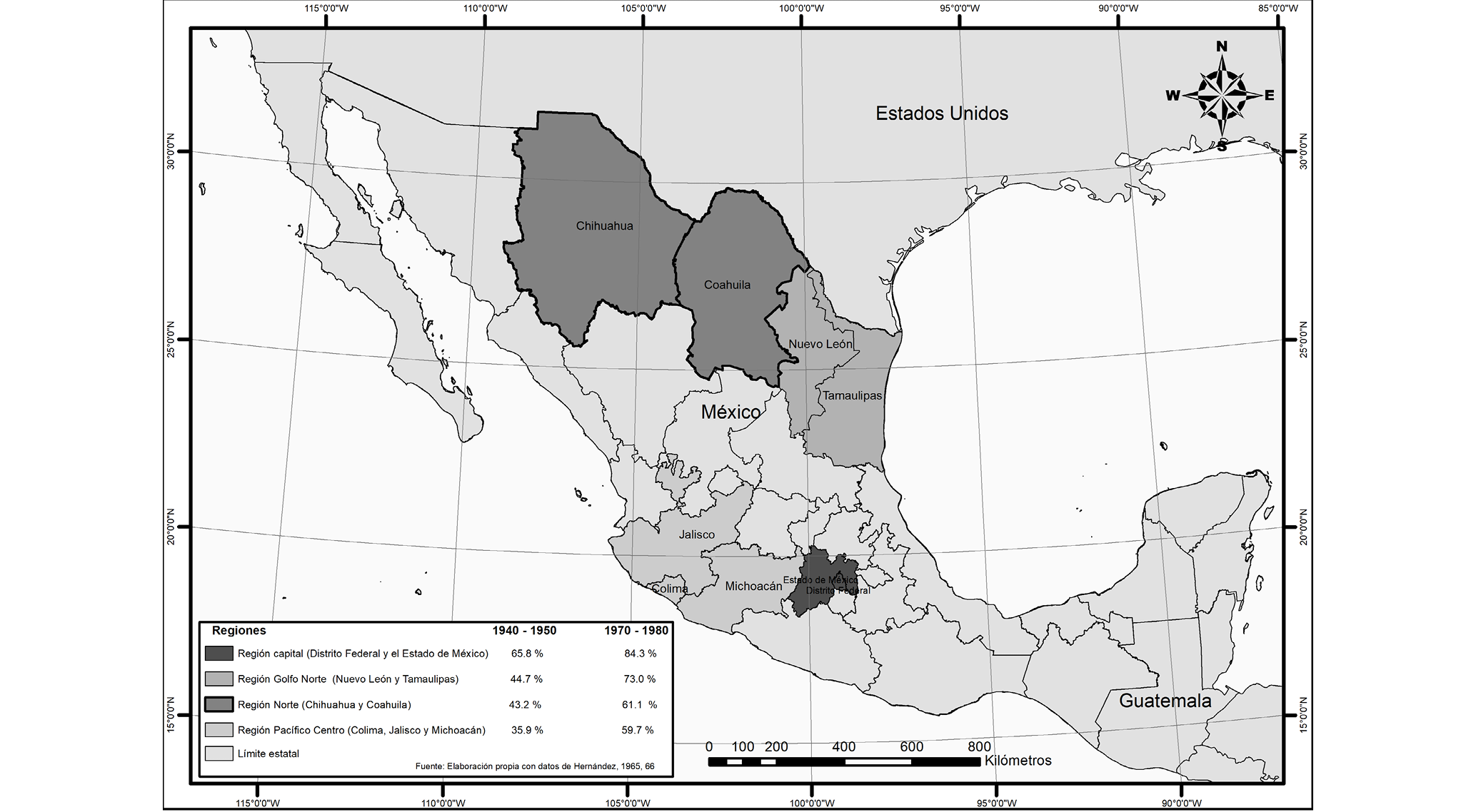 Fuente: elaboración propia basada en la integración de regiones con desarrollo industrial para el periodo de estudio de Hernández (1983, p. 66).