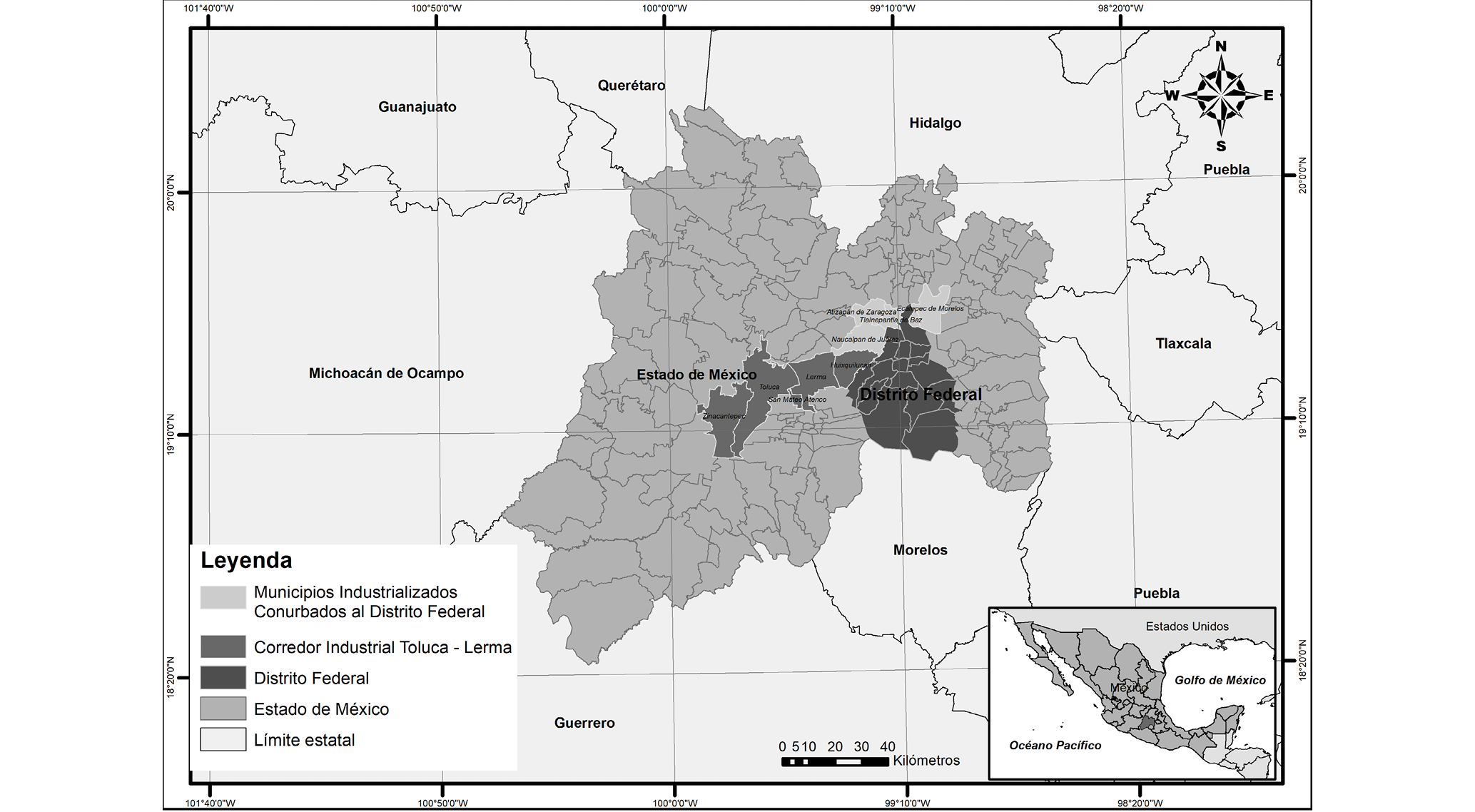 De acuerdo con el estudio de Hernández (1983), entre las regiones que mayor despegue industrial alcanzaron, está la que denominó región Capital, integrada por el df y Estado de México (véase mapa 1).