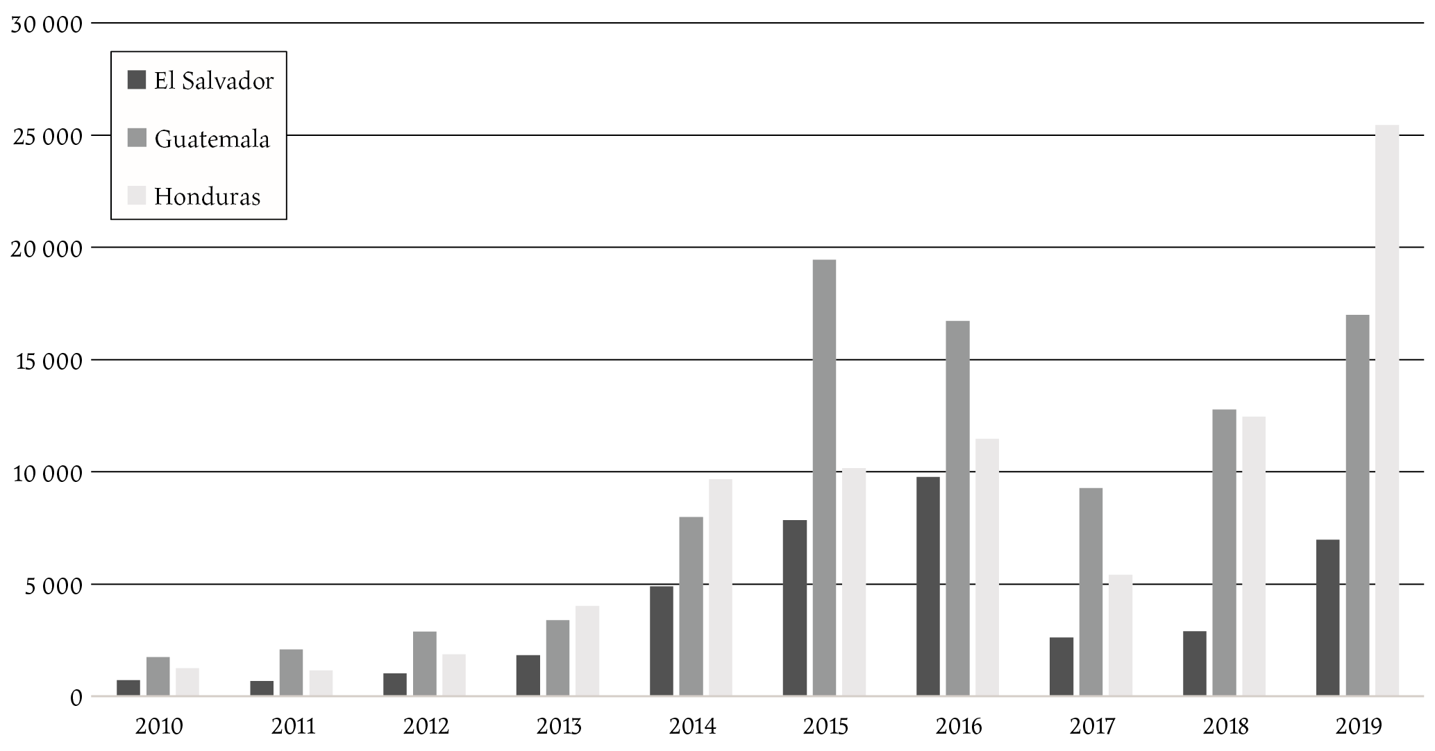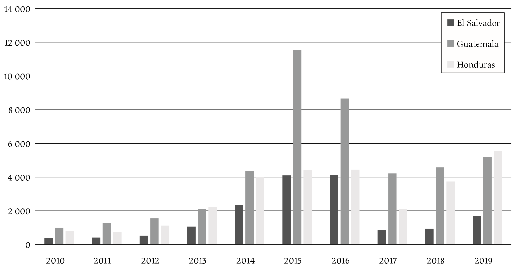 En estos países existe una crisis humanitaria conformada por el incremento de la violencia, la pobreza y la anomia política que existe para resolver esos problemas. Entre los años 2014 y 2016 solamente, en los que hubo además crisis políticas e institucionales sobre todo en Guatemala y Honduras por hechos de corrupción, el número de menores presentados según el Instituto Nacional de Migración (en adelante inm) en México fue de 22 482 menores salvadoreños, 44 125 guatemaltecos y 31 290 hondureños. A lo largo de la década, las cifras son más alarmantes e incrementales. De 2010 a 2019 el total de menores de 17 años presentados ante el inm fue de 39 193 salvadoreños, de los cuales viajaron sin acompañamiento 16 438. También 93 241 guatemaltecos, entre los que viajaron sin acompañamiento 44 510, y, en el caso de los hondureños, fueron presentados 82 902, entre los que había 29 158 menores que se trasladaban sin compañía alguna (inm, 2019). Respecto a la dispersión transnacional de la vulnerabilidad, aquí estas cifras evidencian un problema grave a los derechos humanos de niños y niñas quienes tienen que desplazarse a partir de una vulnerabilidad multifactorial, y, además, enfrentarse durante el tránsito a varias situaciones que incrementan esa condición, entre ellas: desprotección, alimentación deficiente, vulnerabilidad educativa, indocumentación, desconocimiento, inacceso a redes de cuidado, entre otras.