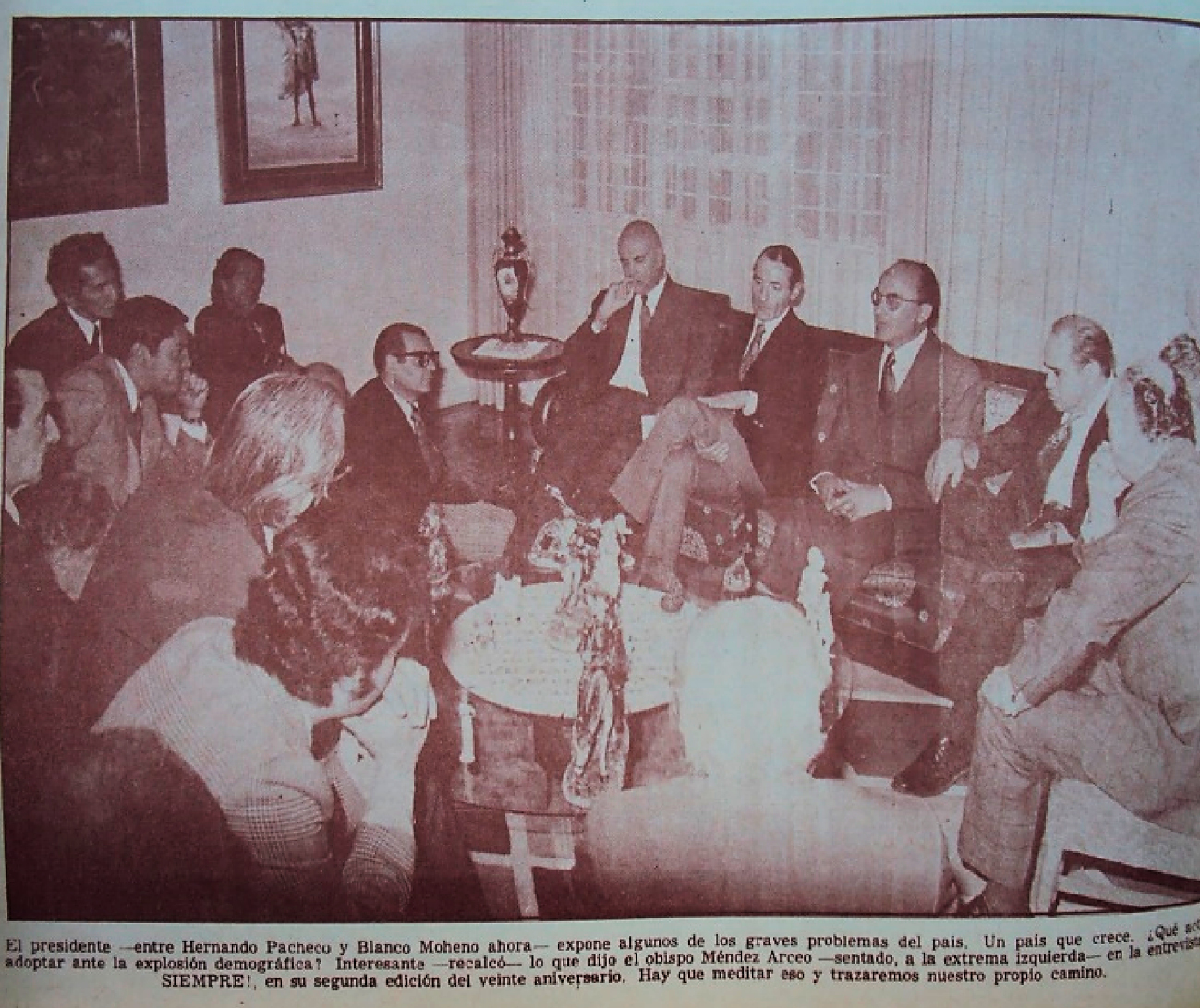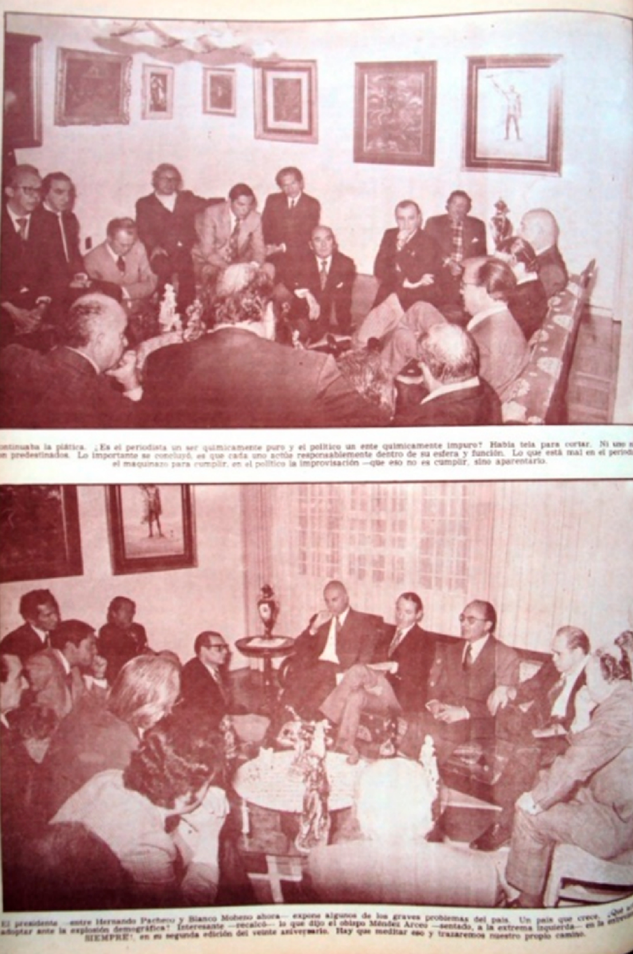 Para analizar esta inserción, utilizamos, entre otras fuentes, fotografías de la celebración conmemorativa de Siempre!, en 1973. Era el aniversario de la fundación del periódico, que cumplía 20 años y las fiestas se llevaron a cabo en la casa de su director, José Pagés Llergo, con la presencia del presidente de México, el obispo de Cuernavaca, don Sergio Méndez Arceo, y varios columnistas de la revista, entre ellos Francisco Julião. El reportaje del evento estuvo a cargo de Carlo Caccioli y fue publicado en la edición del 18 de julio de la revista con el siguiente título “Presencia de la grandeza en un encuentro: Echeverría- Siempre! en el más alto nivel de sencillez, franqueza y respeto”.[36] En su texto, Caccioli exaltó la figura del presidente, alegando ser una “aventura encantadora vivir en el país que gobierna”.[37]