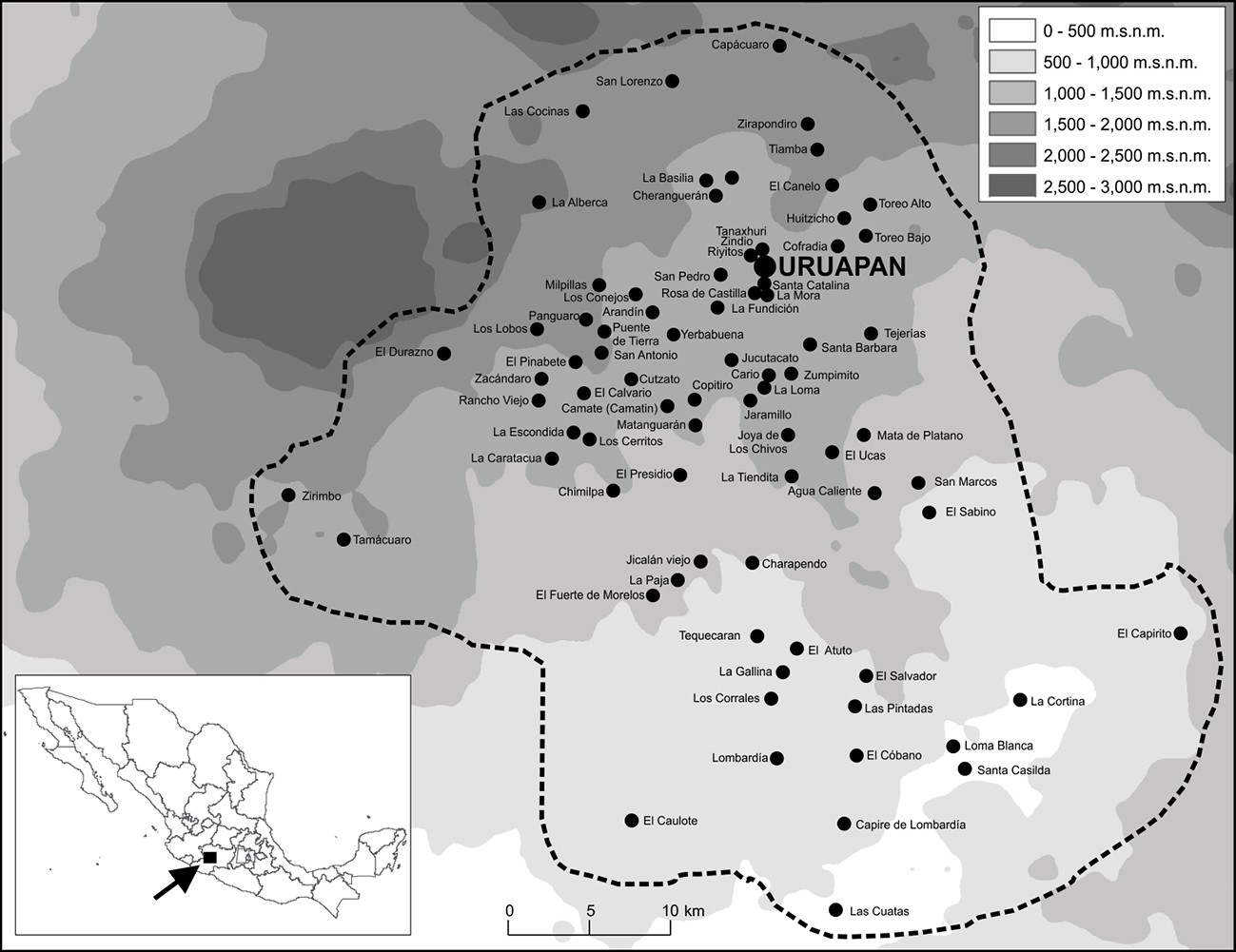 Uruapan se ubica en el centro del estado de Michoacán, a 1 620 msnm con un clima semicálido subhúmedo con abundantes lluvias en verano, el municipio abarca una zona que transcurre entre los 2 340 y los 800 msnm, el clima varía entre el templado subhúmedo con lluvias y el cálido húmedo (inegi, 2005). Es un asentamiento de origen prehispánico, durante el virreinato fue un pueblo de indios, aunque tuvo un proceso de mestizaje que trajo como consecuencia el dominio poblacional de la Gente de Razón, los no indígenas, en la segunda mitad del siglo xviii. En el México independiente se recuperó de los estragos de la guerra y comenzó a adquirir mayor importancia (Talavera, 2011, pp. 22-25, 78 y 266).