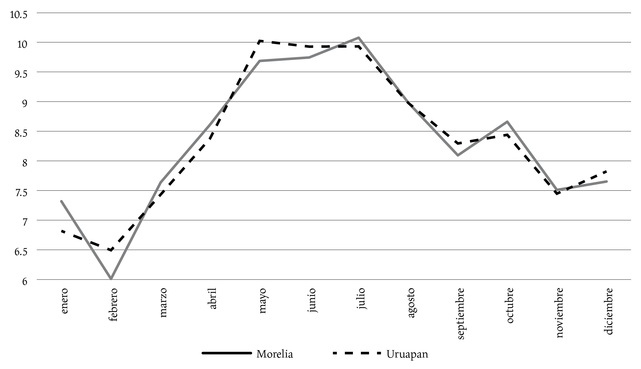 La tbm en Uruapan y Morelia muestra diferencias en varios años, de manera general resultó más elevada en la capital, sobre todo en 1916 cuando se hizo presente una epidemia de tifo; en contraste, en 1918, año de la influenza, fueron próximas las tasas (véase cuadro 1). En el caso de Morelia se cuenta con la captura de datos entre 1913 y 1923. De manera tendencial la capital mostró un empeoramiento en las condiciones de vida, quizás por la migración de personas que buscaban seguridad en las ciudades y que vivieron en condiciones de hacinamiento, marginación y pobreza.