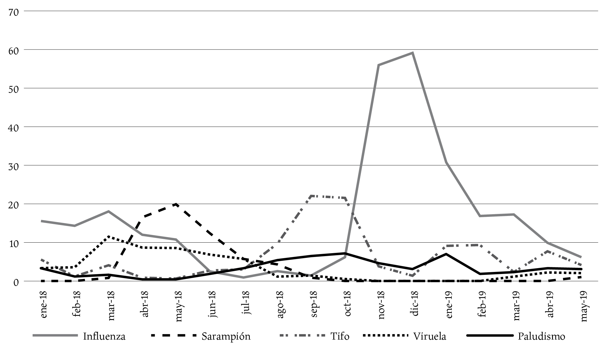 Las enfermedades que generaron un aumento mayor de muertes en 1918 provinieron de los efectos de la influenza. Como parte de los cálculos de la mortalidad por esta pandemia se incluyeron las causas por enfermedades respiratorias como la gripa, pulmonía, neumonía, bronconeumonía, broncopulmonía o fiebre gripal. La principal causa en 1918 fue la influenza con 17.6%, incluyendo las enfermedades respiratorias, seguida por enteritis con 10.7% y disentería con 8.2%. Estas dos últimas eran de las principales causas de muerte en años normales, después siguieron brotes epidémicos como el sarampión (6.6%), tifo (6.2%), viruela (4.1%) y paludismo (3.3%) (véase gráfica 3), en sexto lugar estuvo la diarrea con 5.6%, otra enfermedad de años normales. Si bien agrupando las enfermedades del sistema digestivo, estas quedan en primer lugar; la elevación de las enfermedades respiratorias en un segmento del año evidencia el impacto de la pandemia.
