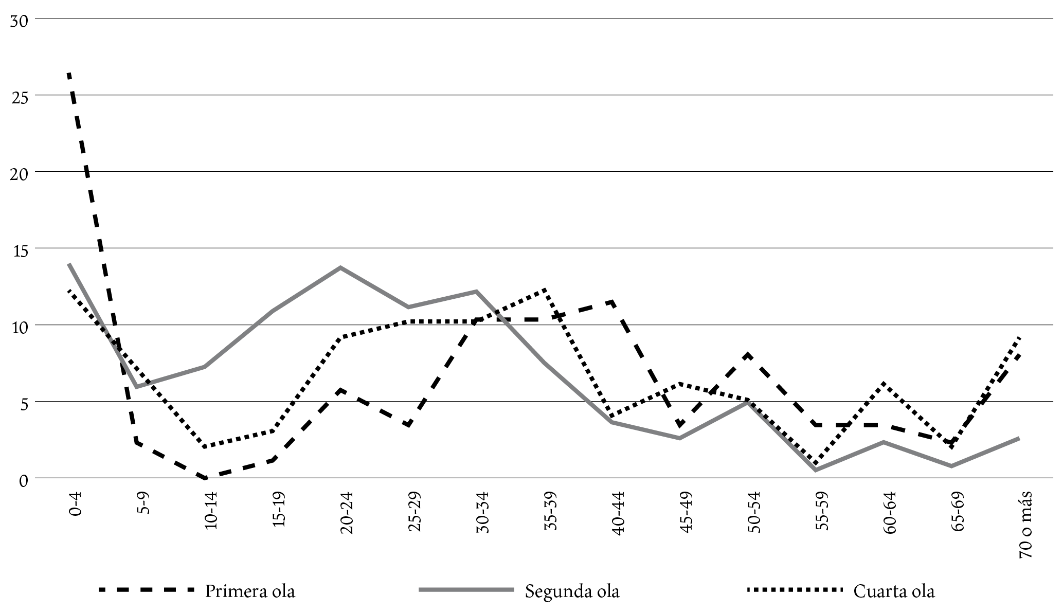 La primera oleada mostró una alteración en la forma de la curva de mortalidad en los grupos de edad debido a enfermedades respiratorias, una forma de W (véase gráfica 5). Si bien los menores de cinco años son los más afectados, disminuye su porcentaje respecto a los años normales; por el contrario, aumentan los grupos de edad de entre 25 y 49 años, al igual que los mayores de 70 años tienen un repunte.