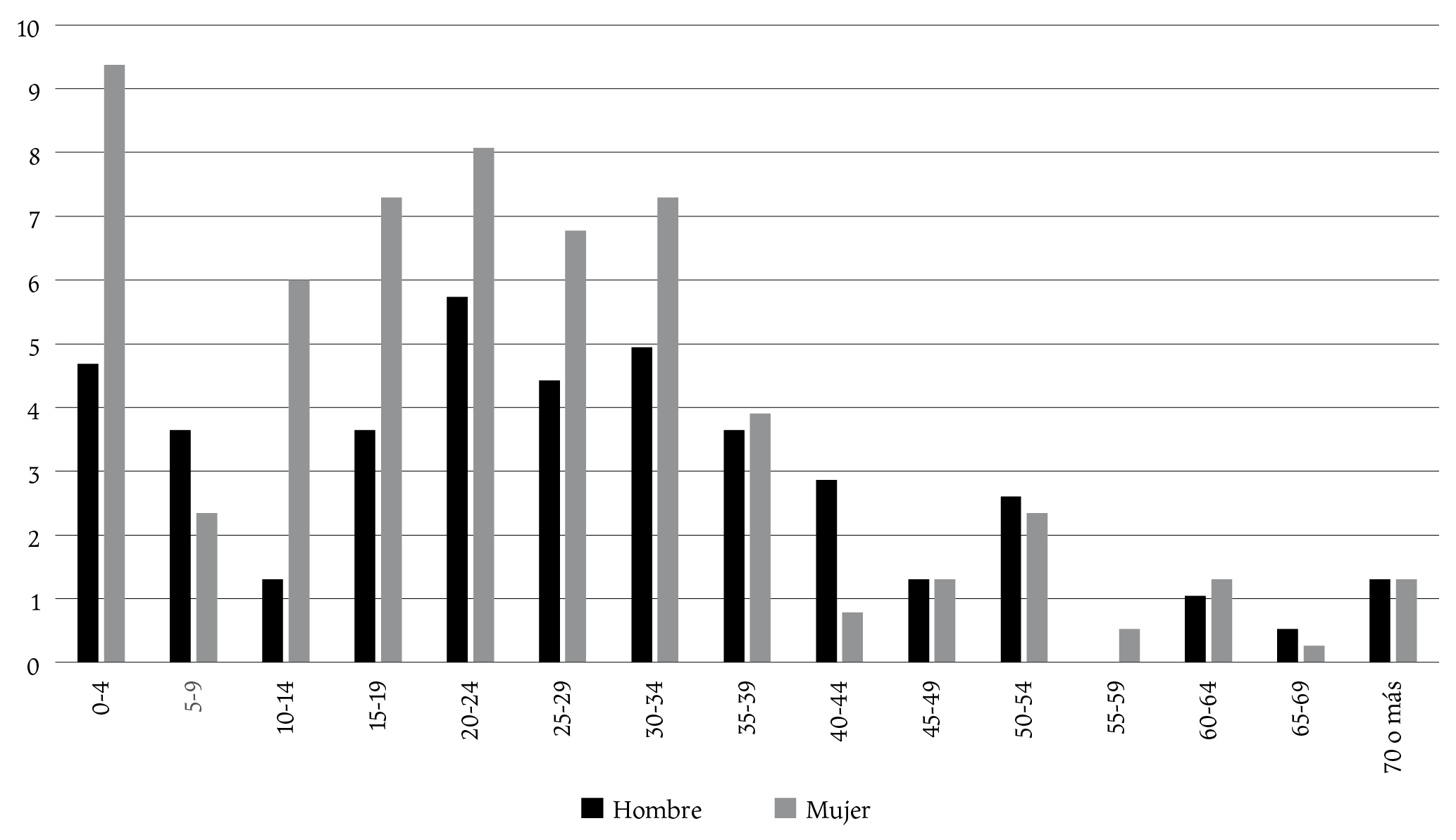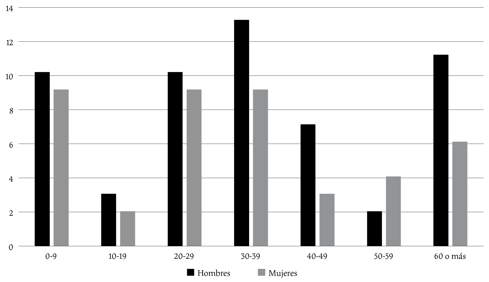 En la etapa crítica, entre noviembre y diciembre de 1918, murieron más mujeres que hombres, 58.9 y 41.7%, respectivamente. Es evidente que murieron más niñas menores a cinco años (véase gráfica 6), en el mismo tenor la proporción de mujeres fallecidas fue superior en los demás grupos de edad, salvo entre los 5 a 9 años, 50 a 54 años, y, sobre todo, entre 40 a 44 años. De manera general los datos son similares a los reportados en Tlaxcala y en Puebla en donde murieron más mujeres que hombres (Cuenya, 2010, pp. 153-155; Netzahualcoyotzi, 2003, p. 133).