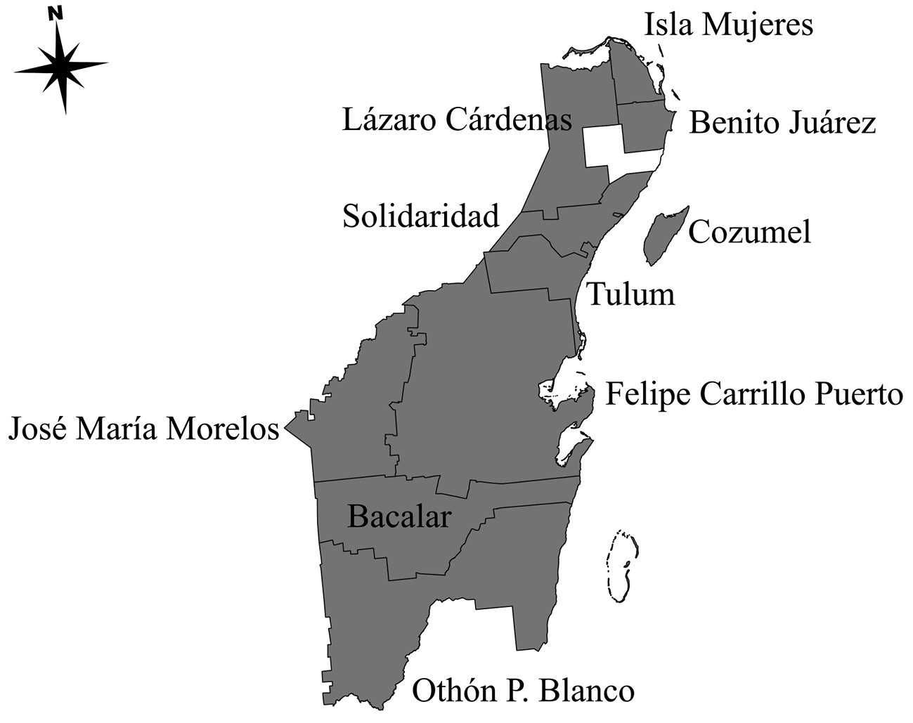 Es preciso señalar que este artículo analiza solamente a diez de los once municipios de Quintana Roo, México, en el periodo del 20 de marzo del 2020 al 30 de abril del 2022. Algunas de las características demográficas de los municipios de estudio se pueden visualizar en el cuadro 1. Se propone la hipótesis de que, en los municipios analizados, a menor vulnerabilidad municipal, los efectos de la Covid-19 disminuyen. Se utiliza un análisis retrospectivo con enfoque cuantitativo de tipo correlacional para diez de los once municipios del estado de Quintana Roo (véase mapa 2). Lo anterior, considerando que Puerto Morelos es de reciente fundación y, por tanto, no se cuenta con información suficiente.