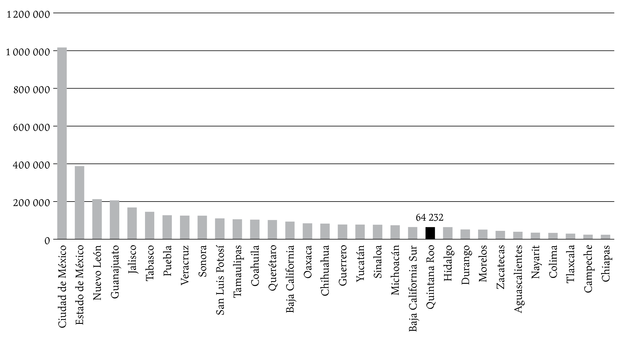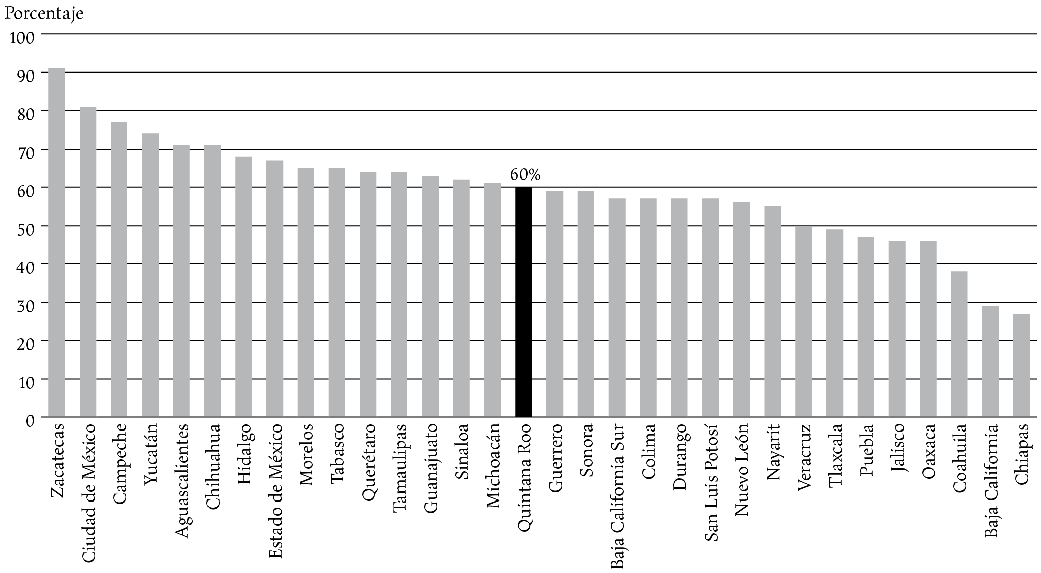 En cuanto a la estrategia de vacunación, al corte del 2 de mayo del 2022, se registran 85 904 997 personas con al menos una dosis de vacuna, lo que representa una cobertura del 87%. De este total, 91% son personas con más de 18 años y el resto menores de edad (de 14 a 17 años) (ssa, 2022a). En cuanto a la cobertura de vacunación de la población que cuenta con más de una dosis por entidad federativa, la del estado de Quintana Roo es de 60%, ubicándolo en la posición 16 a nivel nacional (véase gráfica 3).