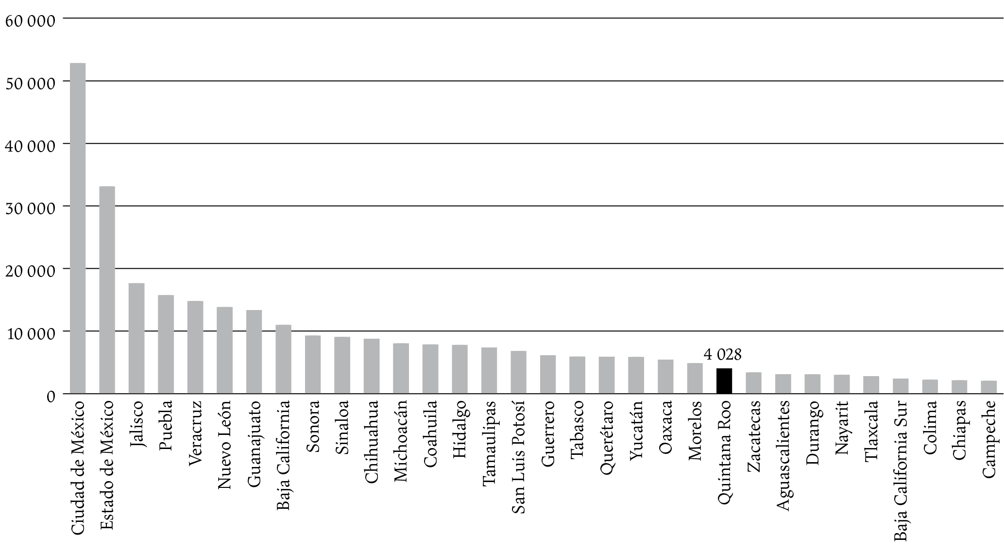 En cuanto a las defunciones, el acumulado al corte del 30 de abril del 2022 posiciona a Quintana Roo en el lugar 23 a nivel nacional (véase gráfica 2) con 4 028 defunciones, lo que representa una diferencia de 48 815 defunciones en comparación con la Ciudad de México, que registra el mayor número de defunciones acumuladas en México.
