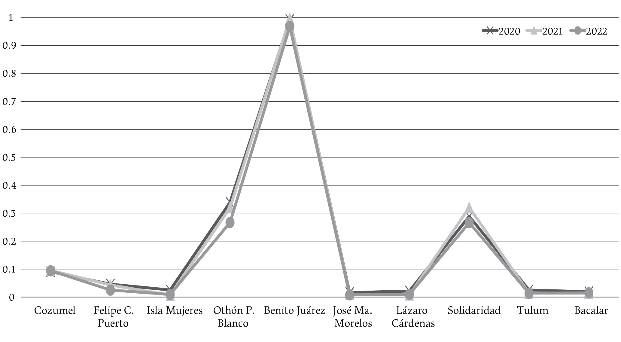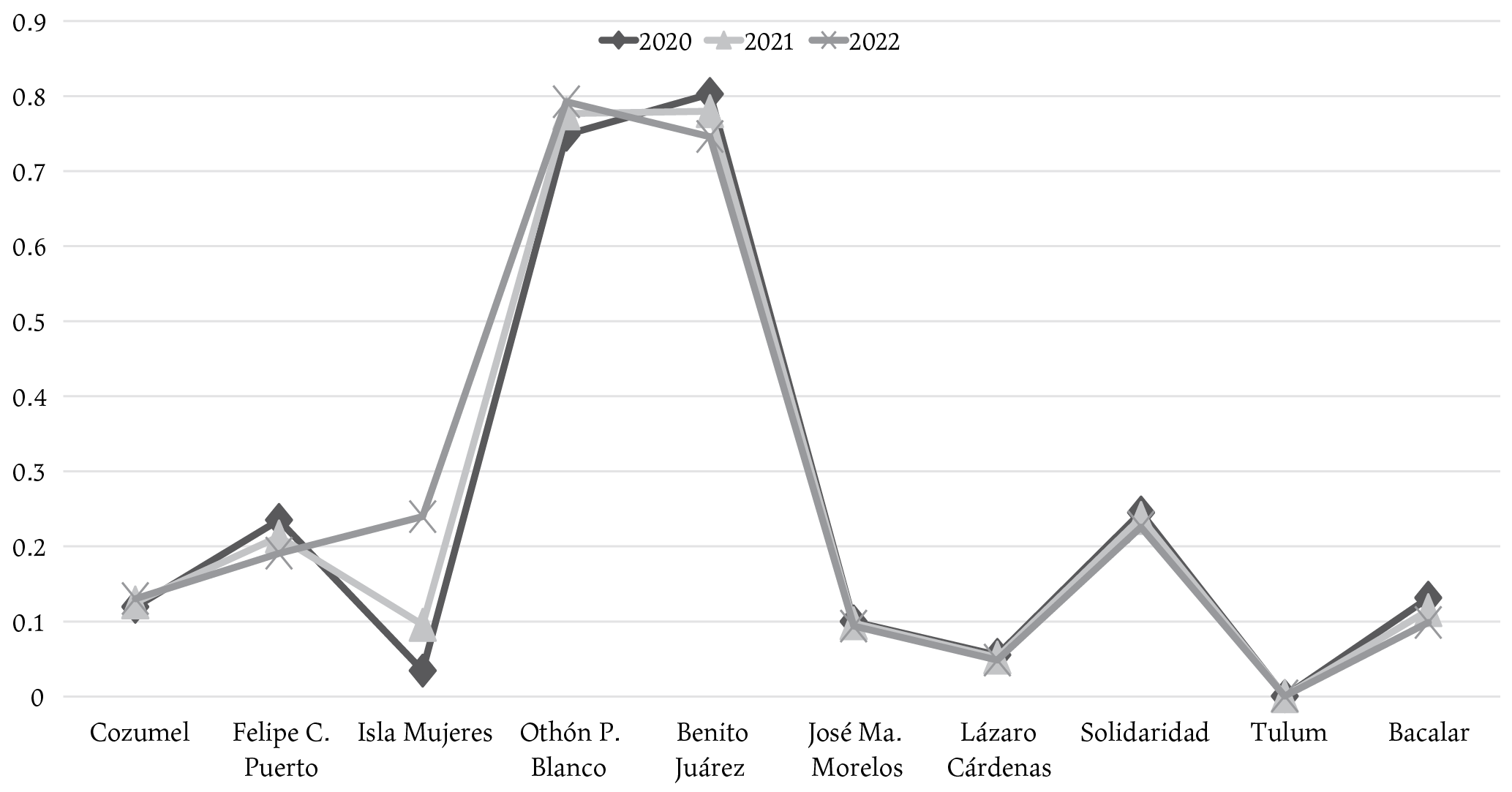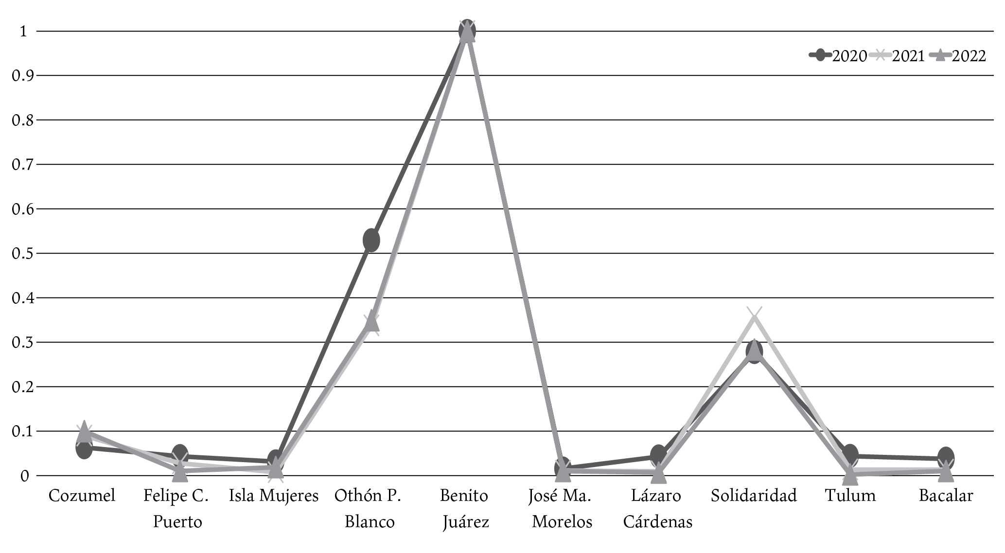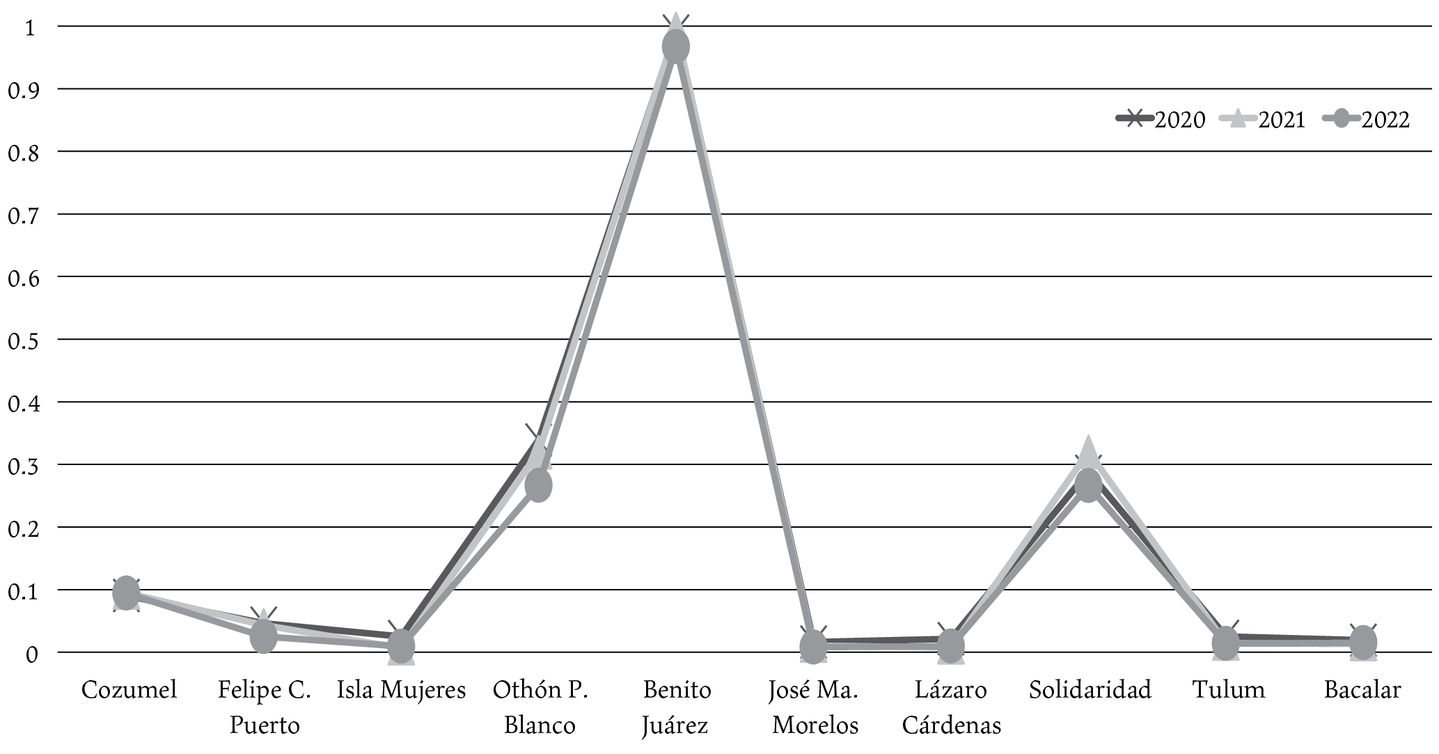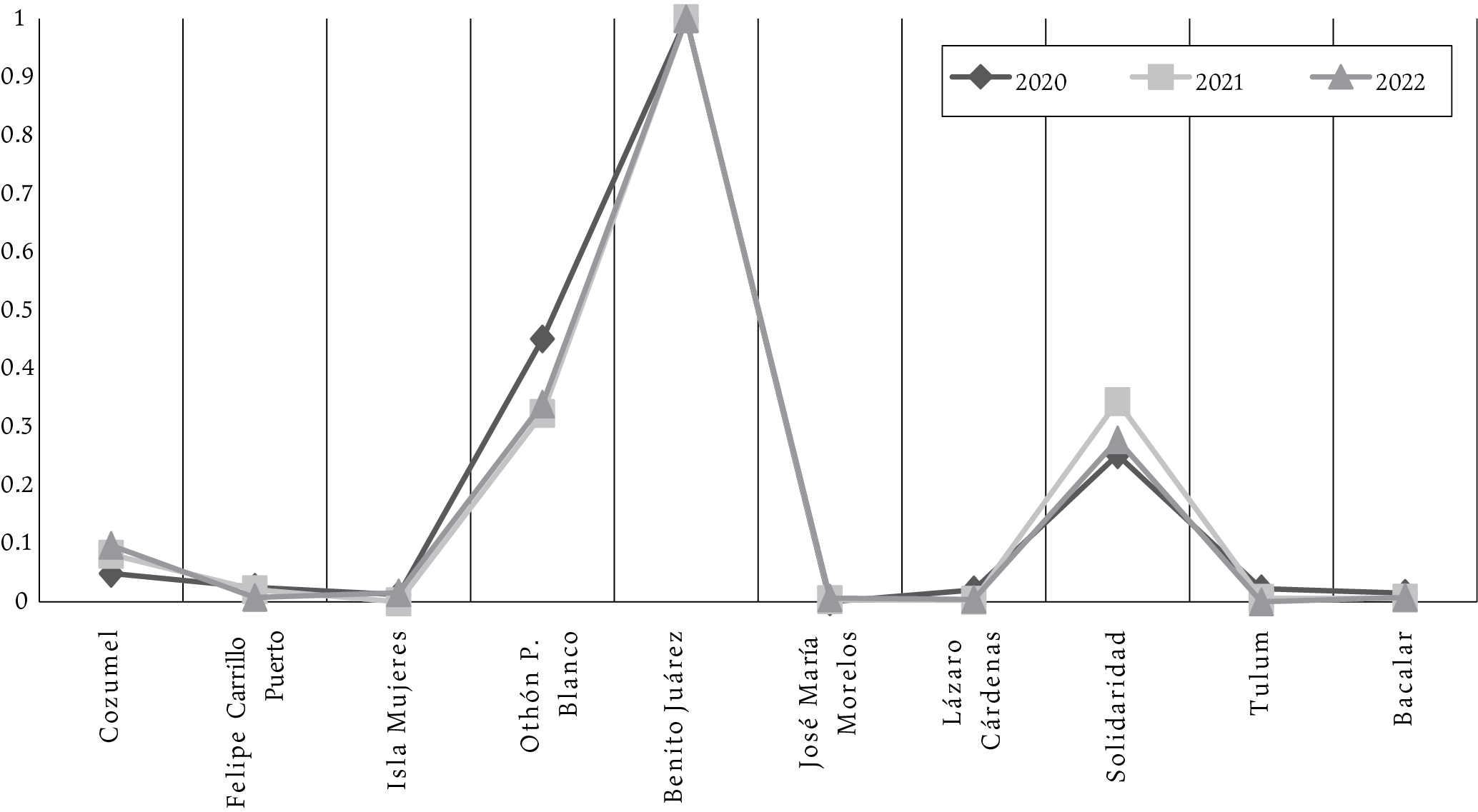 En lo particular, es preciso señalar que Benito Juárez, junto con Solidaridad y Othón P. Blanco, son municipios que han registrado efectos sociales importantes de la Covid-19, a pesar de tener una baja vulnerabilidad. Una explicación en estos casos es que la cabecera municipal de Benito Juárez, Cancún, es la ciudad más poblada y el principal destino turístico del estado de Quintana Roo y, por tanto, concentra la mayor cantidad de infraestructura de bienes y servicios. Además, derivado de las flexibles restricciones impuestas por el gobierno mexicano para el ingreso de ciudadanos extranjeros, la llegada de turismo a la región, aunque en menor medida, continuó aún en los meses más difíciles de la pandemia.