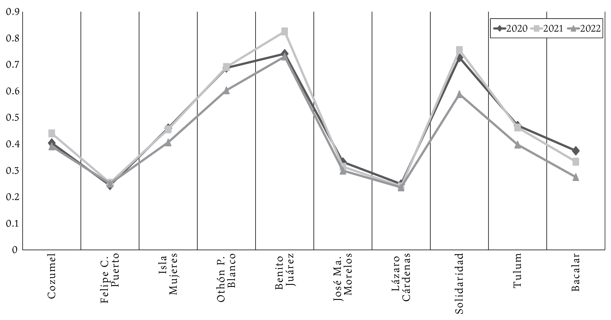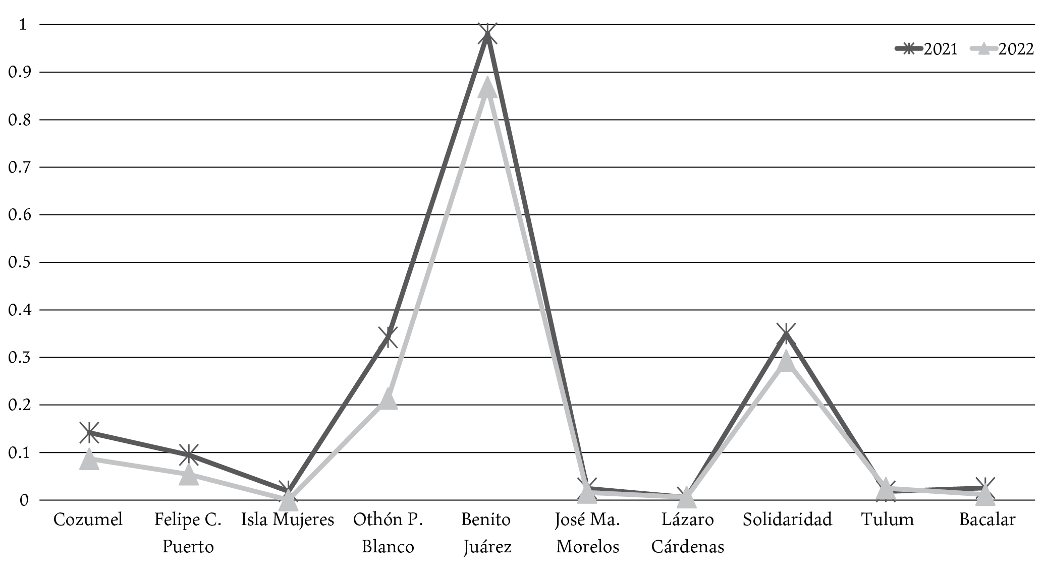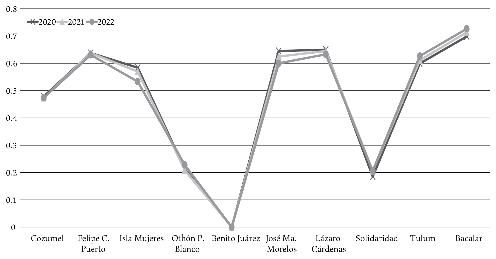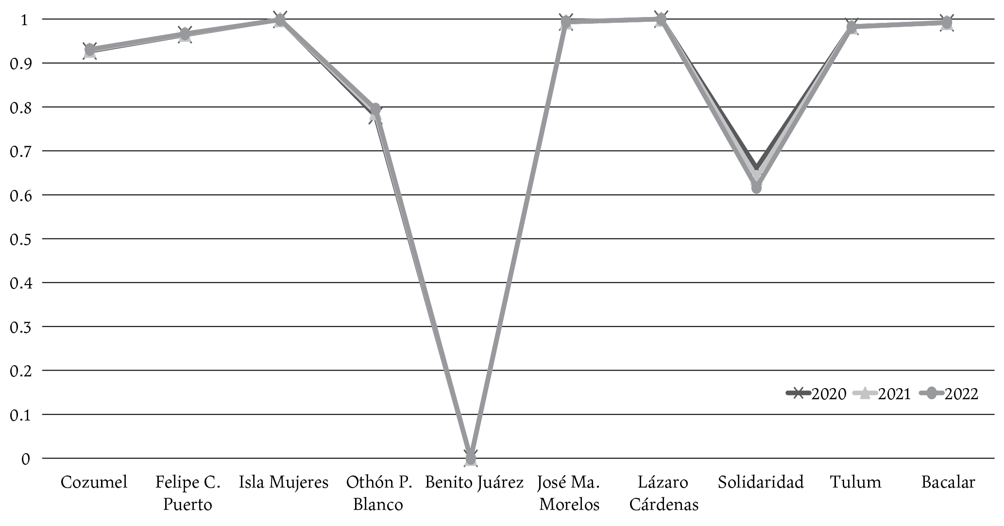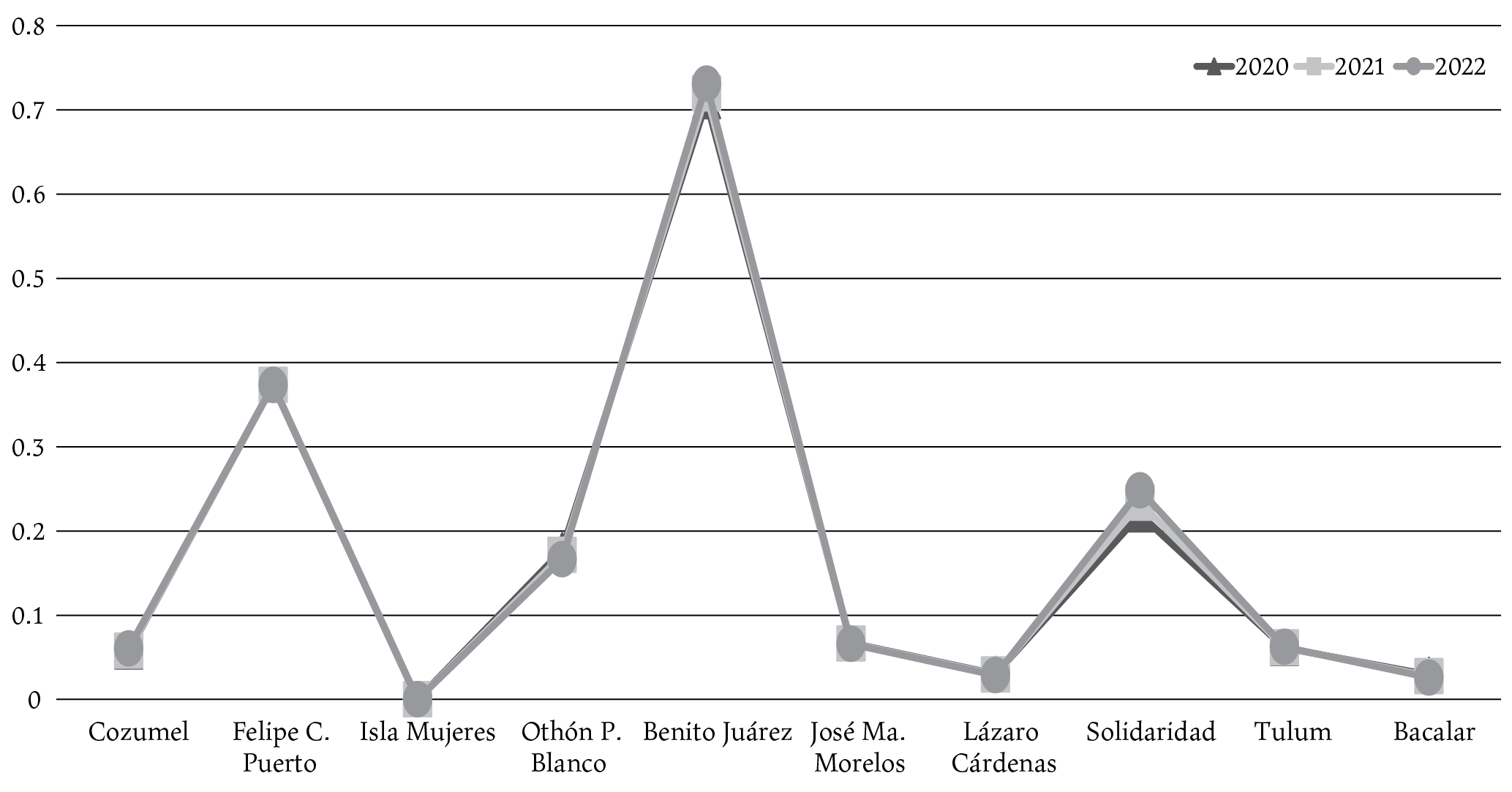 En lo particular, es preciso señalar que Benito Juárez, junto con Solidaridad y Othón P. Blanco, son municipios que han registrado efectos sociales importantes de la Covid-19, a pesar de tener una baja vulnerabilidad. Una explicación en estos casos es que la cabecera municipal de Benito Juárez, Cancún, es la ciudad más poblada y el principal destino turístico del estado de Quintana Roo y, por tanto, concentra la mayor cantidad de infraestructura de bienes y servicios. Además, derivado de las flexibles restricciones impuestas por el gobierno mexicano para el ingreso de ciudadanos extranjeros, la llegada de turismo a la región, aunque en menor medida, continuó aún en los meses más difíciles de la pandemia.
