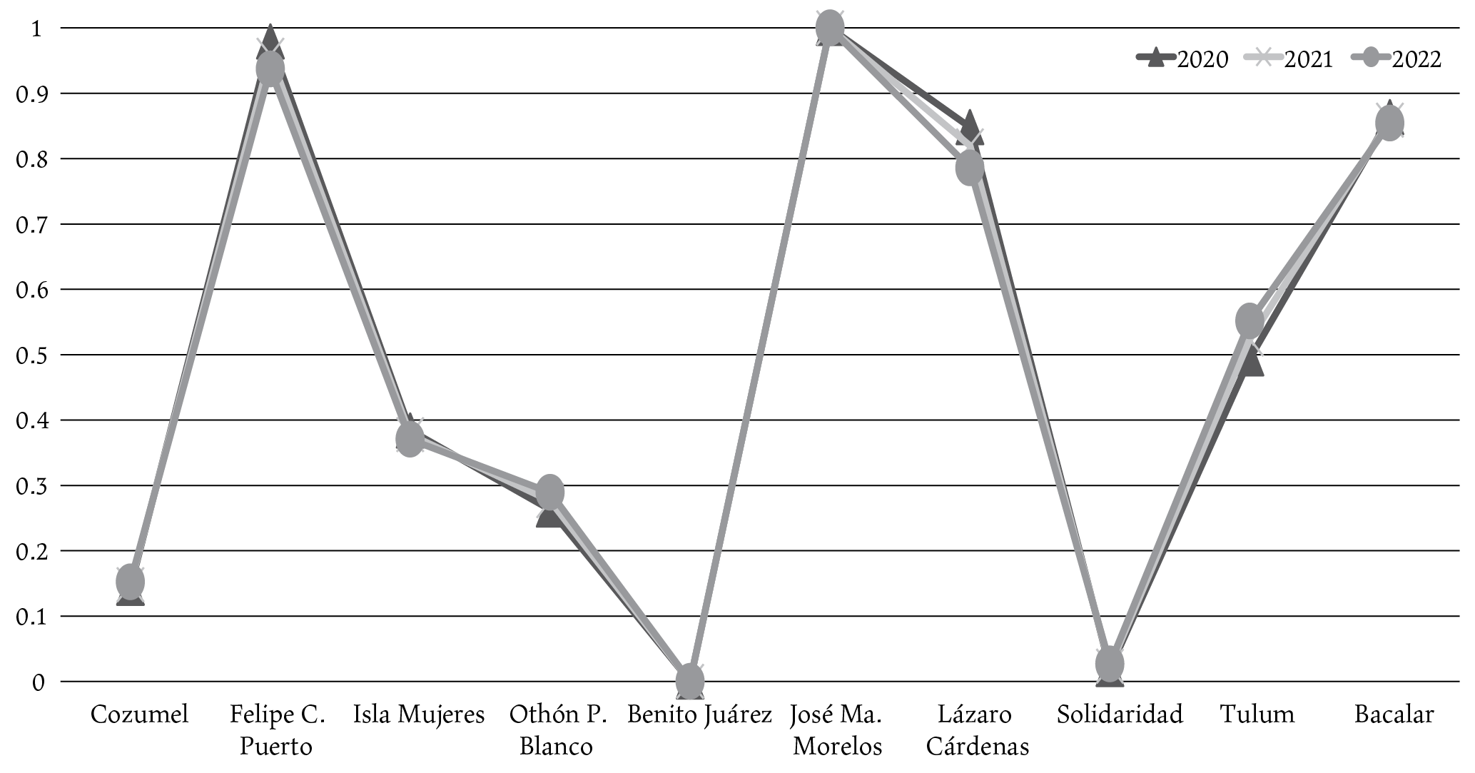 Por consiguiente, determinar la vulnerabilidad municipal en Quintana Roo, además de conocer su relación con los efectos de la Covid-19, es necesaria para focalizar el diseño de políticas públicas que permitan un uso eficiente y coherente de los recursos materiales, monetarios y de capital humano. No obstante, al final del primer semestre de 2022, el escenario respecto a la Covid-19 es desigual; algunos países comienzan a reportar rebrotes de contagios –entre ellos México–, y otros más continúan en su lucha por tener mayor acceso a las vacunas. Situación que, sumado a las alteraciones de las cadenas de suministro, consecuencia del conflicto bélico entre Rusia y Ucrania y la reaparición de viejos virus como la viruela del mono, augura un panorama al corto plazo poco prometedor. En consecuencia, los resultados obtenidos son de gran importancia para el análisis y la identificación del nivel de la vulnerabilidad municipal, lo cual resultará una herramienta necesaria e imprescindible en la toma de decisiones.