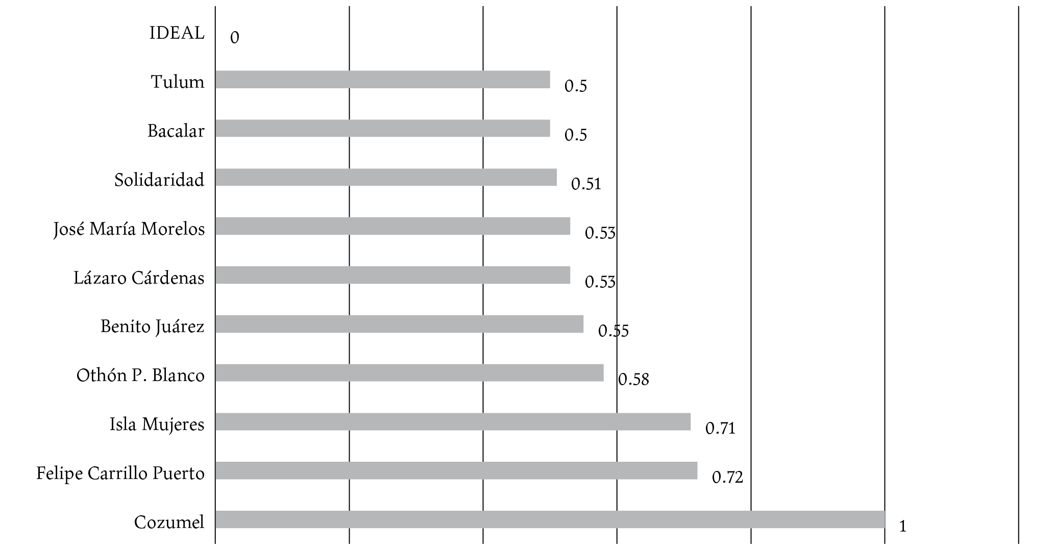 Para reforzar el análisis anterior, se realizó le evaluación de las distancias euclidianas de los valores del ivm y iec19 (véase gráfica 16). Los resultados confirman que, entre menores son los efectos de la Covid-19 y menor la vulnerabilidad municipal, más cerca están los municipios del nivel ideal de comportamiento, esto es, de un muy bajo nivel de vulnerabilidad y muy bajo nivel de contagios. En este caso, los municipios de Bacalar y Tulum mostraron menores contagios y menor vulnerabilidad y, por consiguiente, más cerca está del nivel ideal (con una distancia euclidiana de 0.50). En el polo opuesto, Cozumel es el más lejano, con la mayor distancia euclidiana de los municipios (con un valor de 1.00).